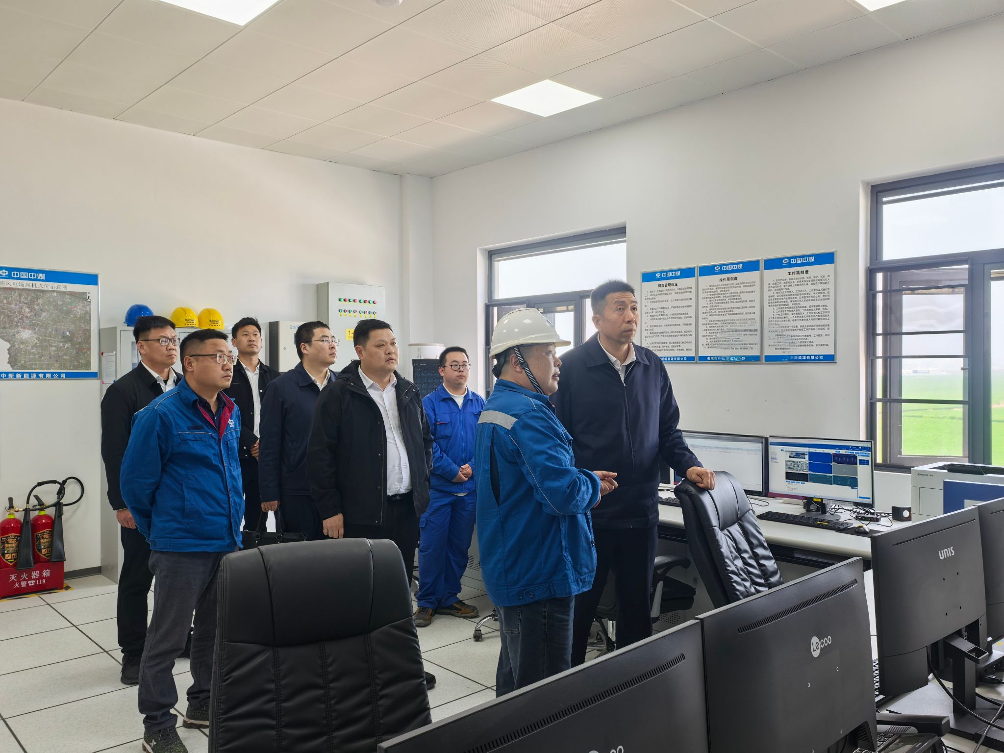 在项目部中控室,刘峰仔细查看风机运行监控、电力系统监控等系统运行数据,与现场技术人员亲切交流,详细了解项目基建、机组调试、安全生产管控及员工生活保障等情况,对项目部在项目攻坚阶段的工作成效给予肯定。随后,刘峰前往风机机位点,实地察看风机塔基及塔筒外部的整体稳定性,并对塔筒内部的升降设备、安全通道等核心部位进行了检查。