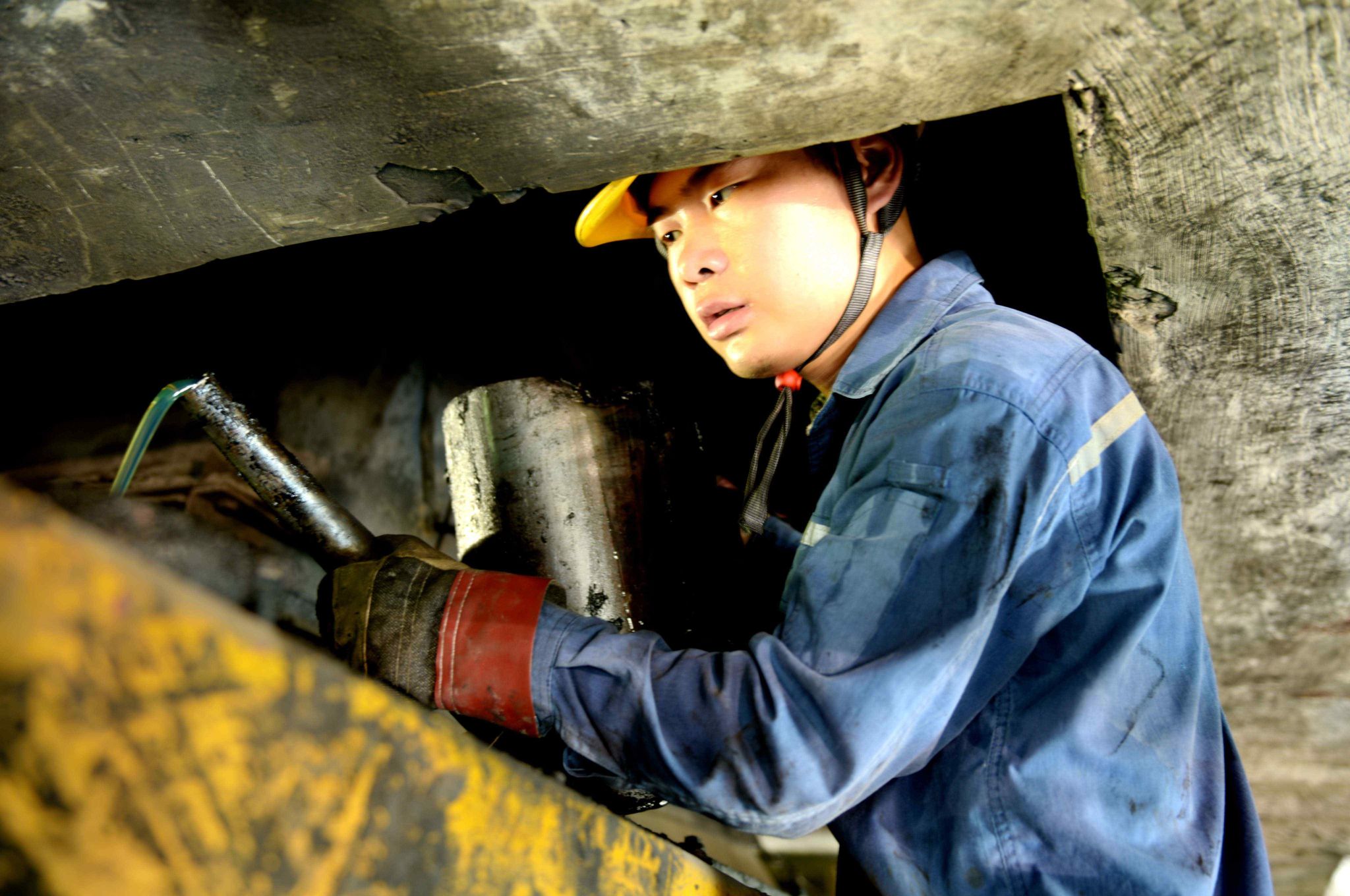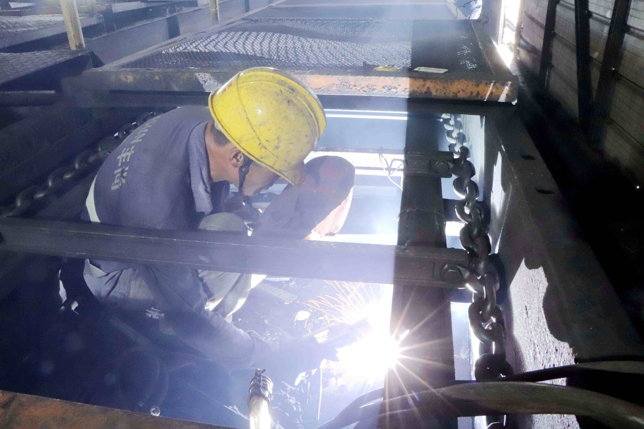 “焊接煤泥水管路下面的沙眼时,就怕仰焊,拿着面罩,系着保险带站在人字梯上,作业不方便就算了,但汗水滴进眼里的那种感觉说不出来有多难受……”电焊工于永军说。