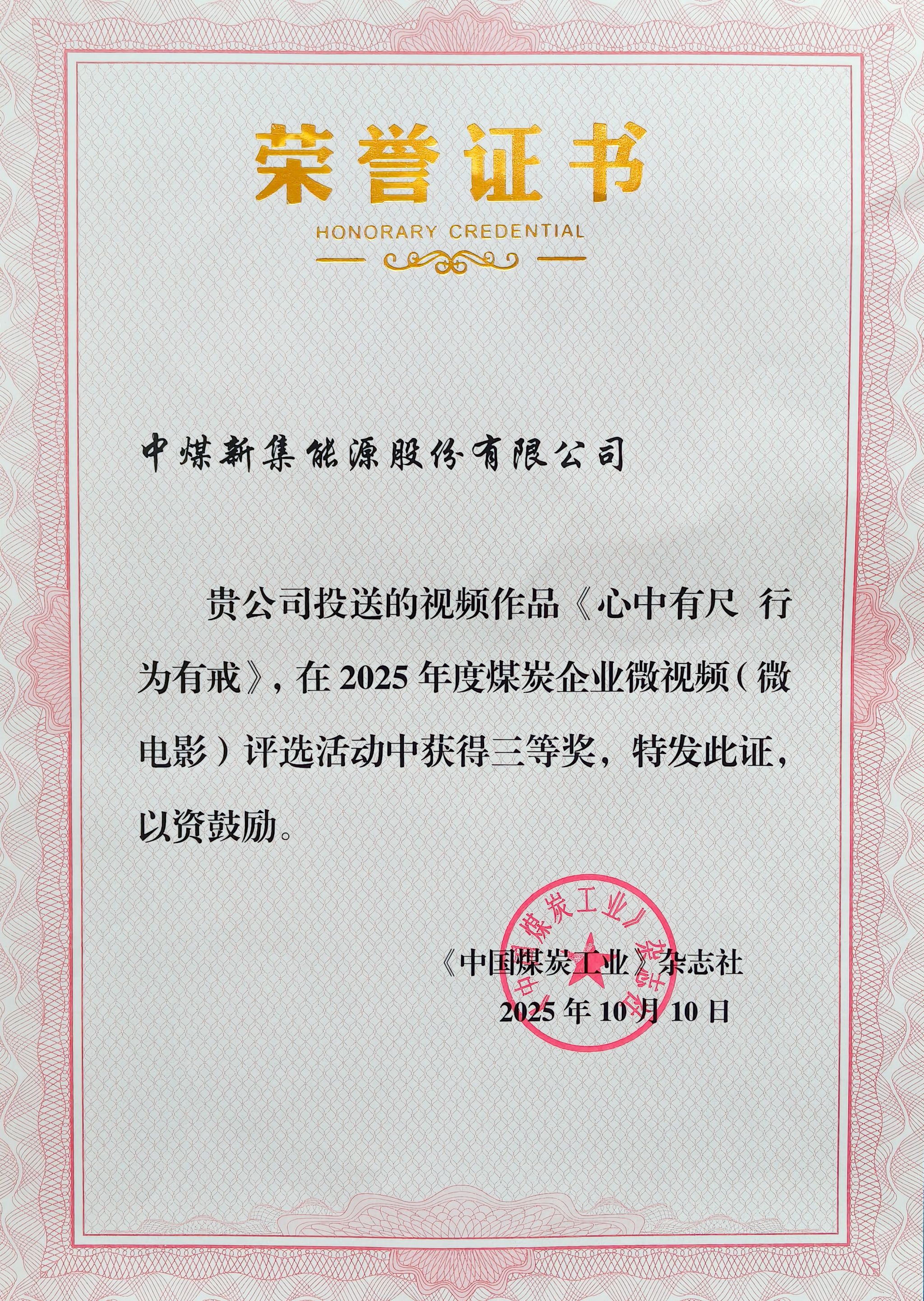 近日,从煤炭工业杂志社传来喜讯,公司报送的微视频作品《心中有尺 行为有戒》荣获2025年度煤炭企业微视频(微电影)评选活动三等奖。