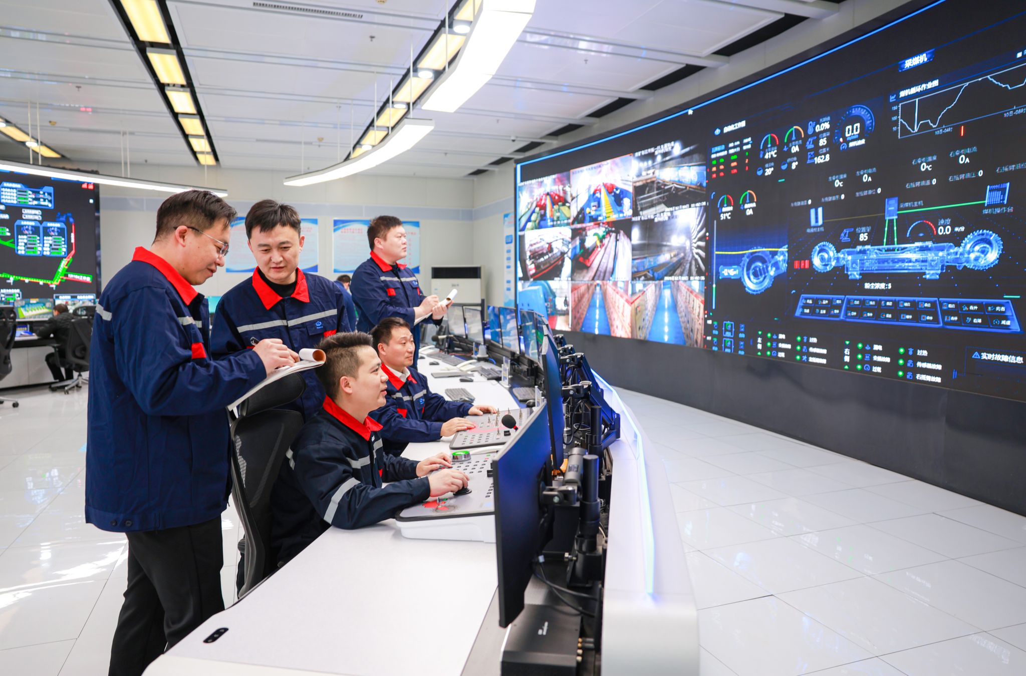 “刚上班的时候,采煤队主要靠人海战术,拉架、移架、推溜、扛柱,一个班需要几十号人,忙得像打仗一样。如今智能综采工作面有5G通讯、三机集控、采煤机和液压支架远控,液压支架还能自动跟机,采煤机也能记忆截割,产能大幅提高,我们干的活可轻松多了。”在井下干了二十多年的老师傅杨中奎感慨道。