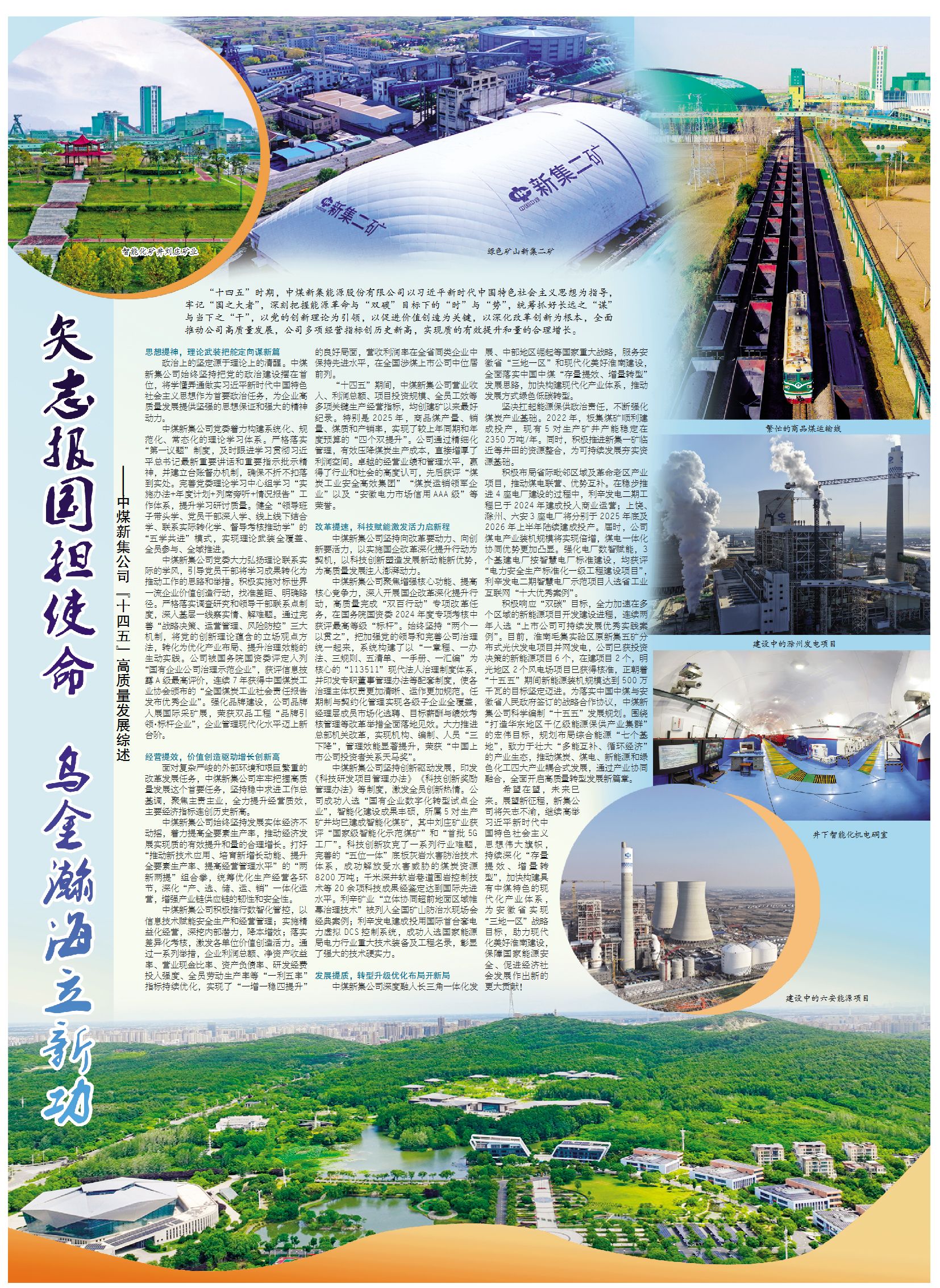 “十四五”时期,中煤新集能源股份有限公司以习近平新时代中国特色社会主义思想为指导,牢记“国之大者”,深刻把握能源革命与“双碳”目标下的“时”与“势”,统筹抓好长远之“谋”与当下之“干”,以党的创新理论为引领,以促进价值创造为关键,以深化改革创新为根本,全面推动公司高质量发展,公司多项经营指标创历史新高,实现质的有效提升和量的合理增长。