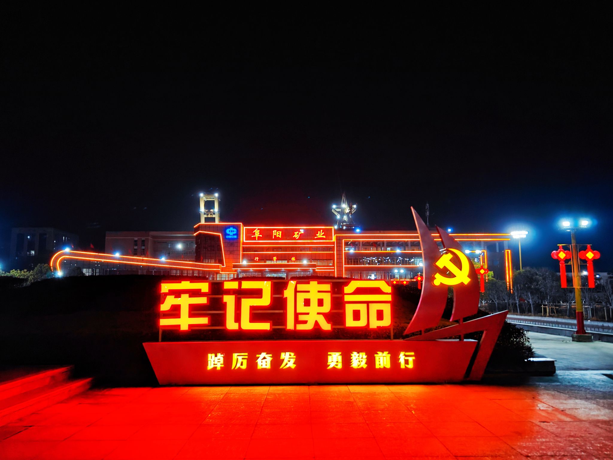 当暮色轻笼矿区,11层A座公寓与职工宿舍楼顶的指示牌次第亮起,如星辰般锚定每一位矿工的归途。主道两旁,新装设的五星红旗路牌灯舒展着鲜亮的光晕;二道门处彩灯流转,宛若虹桥横跨星河;升旗台两侧“不忘初心、牢记使命”八个大字,如信念灯塔在夜色中熠熠生辉;工广灯柱上的“中国结”灯饰,洒下温润光影;五彩圆灯点缀其间,如烟花绽放;行管楼上“阜阳矿业”四个大字厚重清晰,是标识更是承诺;远处井塔通明,与深邃天幕相映……这漫山流淌、跳动的灯火,照亮的不仅是夜色,更温暖和熨帖了每一颗为明天奔忙的心灵。