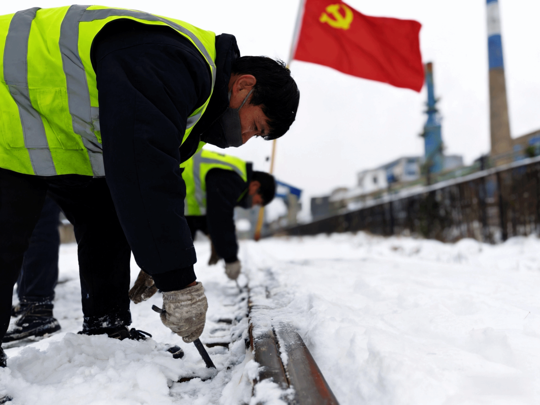 1月19日晚,雪势正紧,全体应急人员已抵达各自岗位。在刘庄站、梁庄站等枢纽站场,由党员、团员、技术骨干组成的6支应急突击队,顶着凛冽寒风和扑面雪花,对全站道岔展开“拉网式”清理。他们俯身用工具甚至徒手,仔细清理滑床板、尖轨与基本轨之间每一处可能卡滞的冰雪。在无人值守的智能化道口,维护人员加强远程监控与现场巡查,及时清理铺面积雪,确保栏木正常起落。风雪中,党旗、团旗在一线高高飘扬,尽管风雪模糊了视线,严寒冻麻了手脚,但无人退缩,持续奋战直至所有道岔转换灵活、线路状态达标。这支平均连续作业超6小时的队伍,以“雪不停、人不撤”的顽强作风,诠释了铁运人特别能吃苦、特别能战斗的硬核本色。
