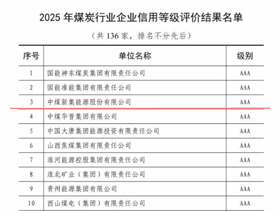 近日,中国煤炭工业协会公布2025年煤炭行业企业信用等级评价结果,公司凭借出色的信用管理水平和诚信经营实践,在全国煤炭企业中脱颖而出,获评最高信用等级——AAA级。