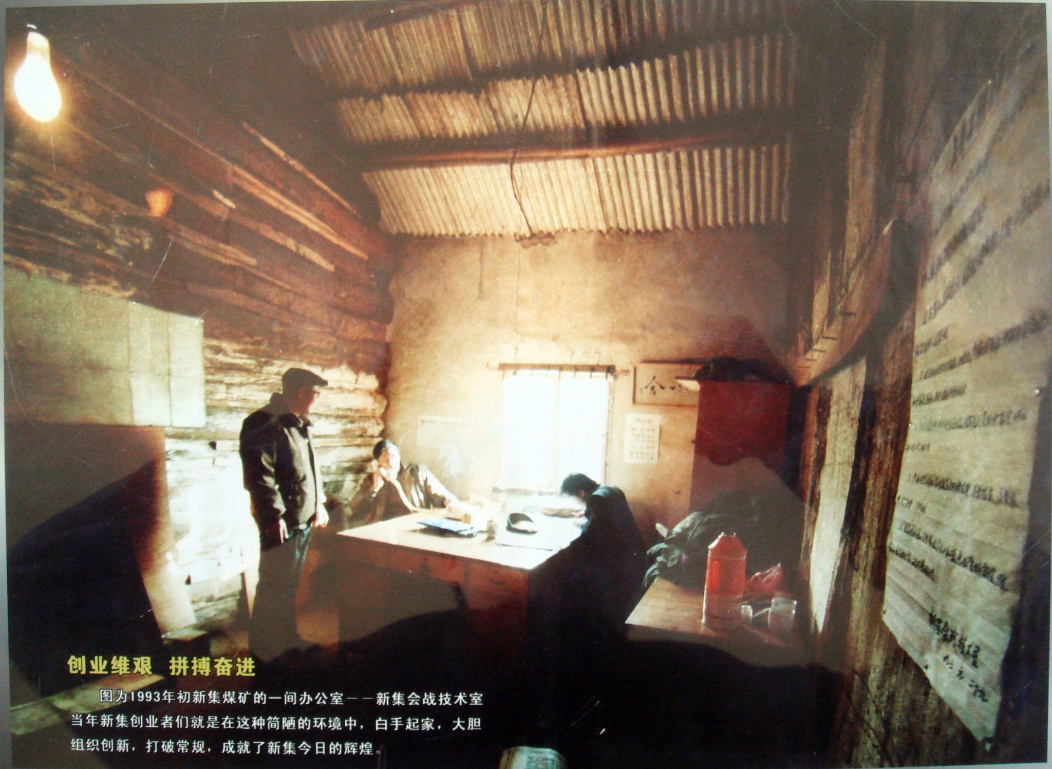 “那是一个物资匮乏、条件艰苦的年代。”1989年进矿的“老新集”郭守跃说,面对一无资金、二无人才、三无设备、四无城市依托的艰难困境,新集人给出了最朴素的答案:啃馒头、吃咸菜、睡草棚。为了筹措启动资金,他们甚至从王集信用社借用了当地农民卖鸡蛋的钱来购买设备和材料。矿井建设初期的创业者们,继承和发扬中国煤矿工人“特别能吃苦,特别能战斗”的光荣传统,大庆人“没有条件创造条件也要上”的艰苦创业精神和“艰苦奋斗,勤俭办矿”的石屹节矿风,充分挖掘干部职工的积极性、创造力,在努力走出煤矿建设新路子的实践中,形成了以“创一流,争第一,勤奋、节俭,多奉献”的新集精神。这种精神,如同一粒火种,在荒原上坚强地燃起。它也成了一代代新集一矿人血脉中流淌的基因。凭借这种精神,新集一矿人创造了举世瞩目的“新集速度”“新集经验”和“新集模式”,赢得了党和国家领导人的高度赞誉。