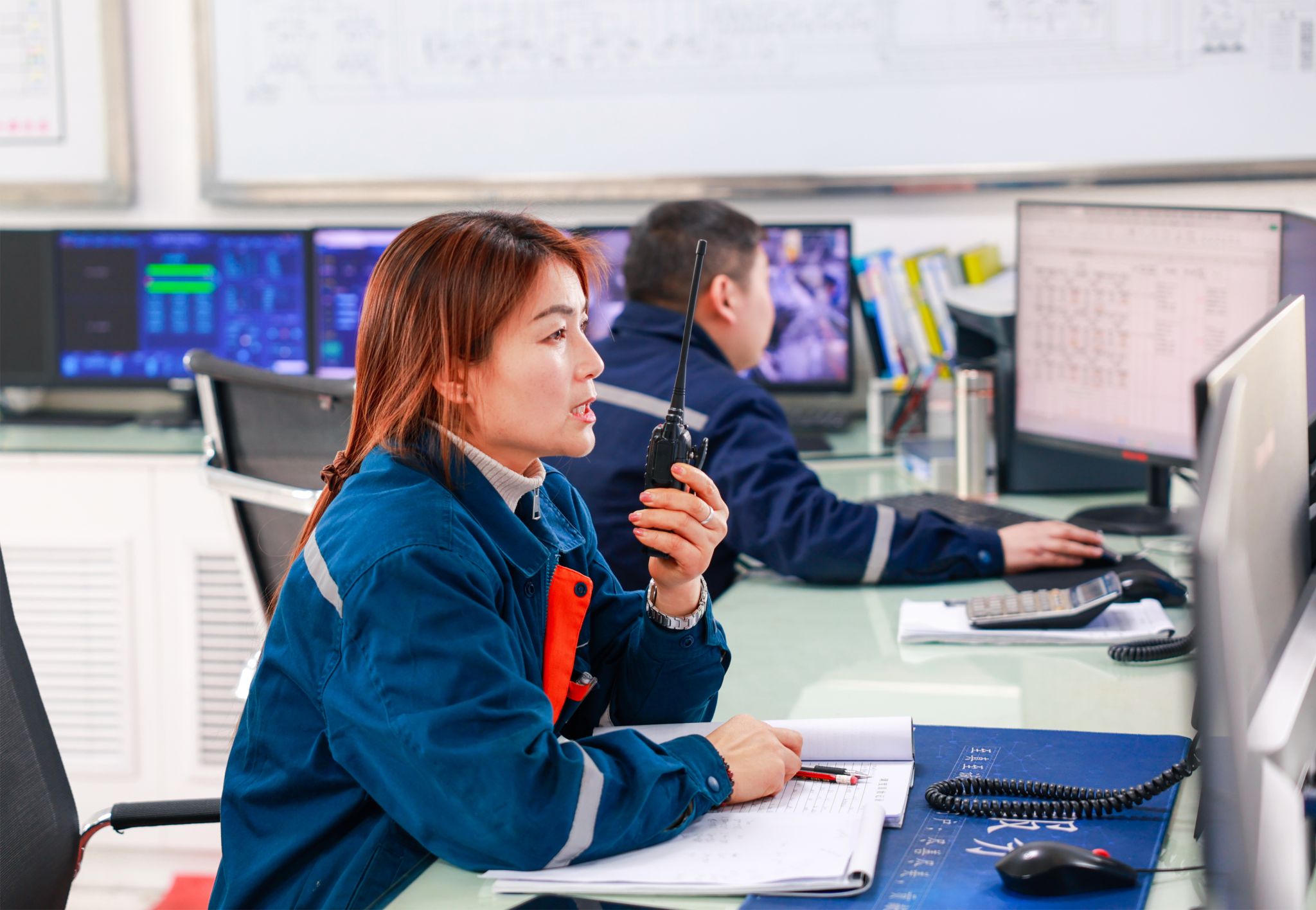 谢昌美面前的三台显示器上,实时显示着选煤厂各系统的生产进度、设备运行等关键数据。“我们的工作就像‘千里眼’和‘顺风耳’,必须时刻保持清醒,不能有丝毫马虎。”谢昌美一边快速记录着对讲机里传来的信息,一边在调度日志上标注重点,“每一次指令的下达,都要精准无误,因为这直接关系到井下工友的安全和生产的顺畅。”