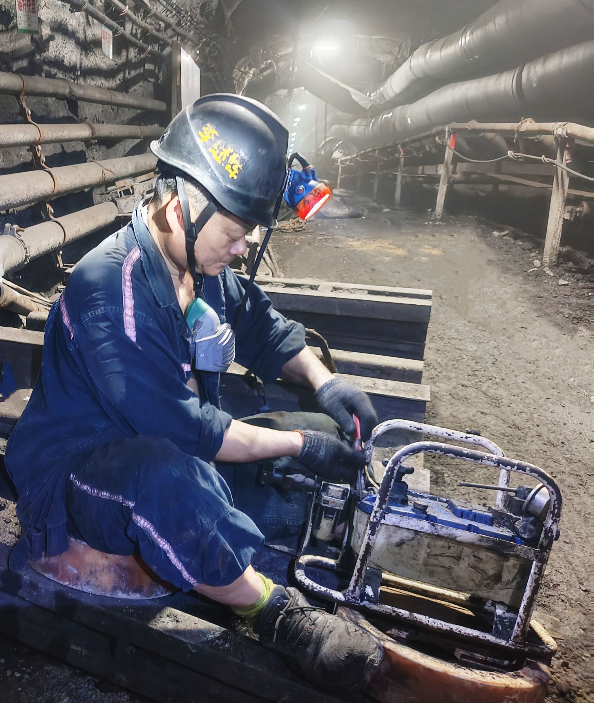 交接班的片刻间隙,在巷道硐室昏黄的灯光下,笔者才得以细看他那双布满老茧的手——指节因常年用力而粗大变形,掌心布满深浅不一的皲裂,像干旱土地上纵横的沟壑,指甲缝里嵌着洗不净的黑痕,那是煤岩粉末与岁月共同打磨的印记。这双手,能精准判断锚杆的扭矩是否到位,能灵敏感知设备轴承的异常振动,也能在职工遇到困难时,传递温暖而坚实的力量。这双手,是他十八年如一日扎根井下一线的无声见证,记录着无数个与岩石博弈、与时间赛跑的日子。