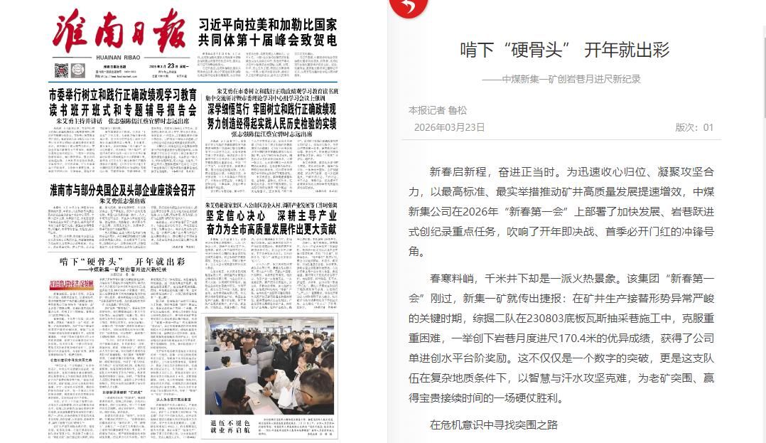 从科学的设备选型与生产组织,到针对性的工艺革新与难题破解,再到人性化的环境改善与激励保障,新集一矿围绕“安全、高效、快速、协同”这一核心,打出了一套环环相扣、系统推进的“组合拳”。这170.4米的岩巷月进尺,不仅是单进水平的突破,更是老矿在困境中勇于探索、善于创新、敢于胜利的精神缩影。它为新集一矿缓解采掘接续紧张局面赢得了至关重要的时间,也为同类条件下岩巷安全高效掘进积累了宝贵经验。截至3月18日,该矿掘进进尺序时完成1983.4米,超计划306米。