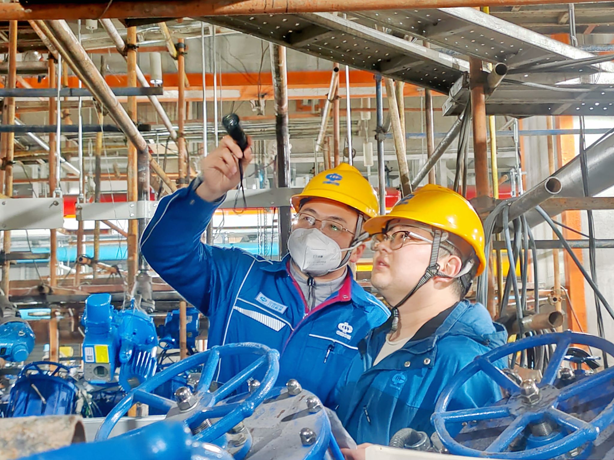 脚下是镂空的格栅板,头顶是交错的管线,师徒二人的身影在钢铁丛林里显得格外坚定,让过硬的专业技能与沉甸甸的岗位责任,在一线攻坚的战场上接力传承。