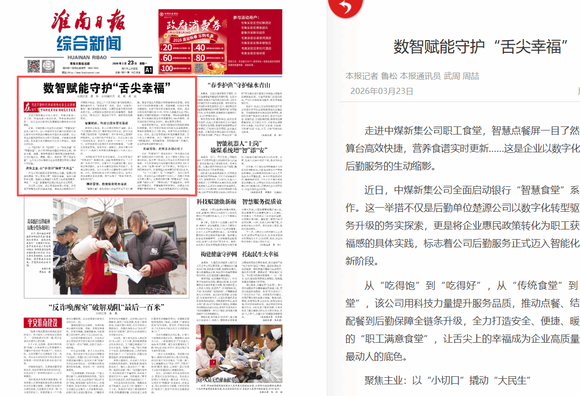 走进中煤新集公司职工食堂,智慧点餐屏一目了然,智能结算台高效快捷,营养食谱实时更新……这是企业以数字化改革赋能后勤服务的生动缩影。