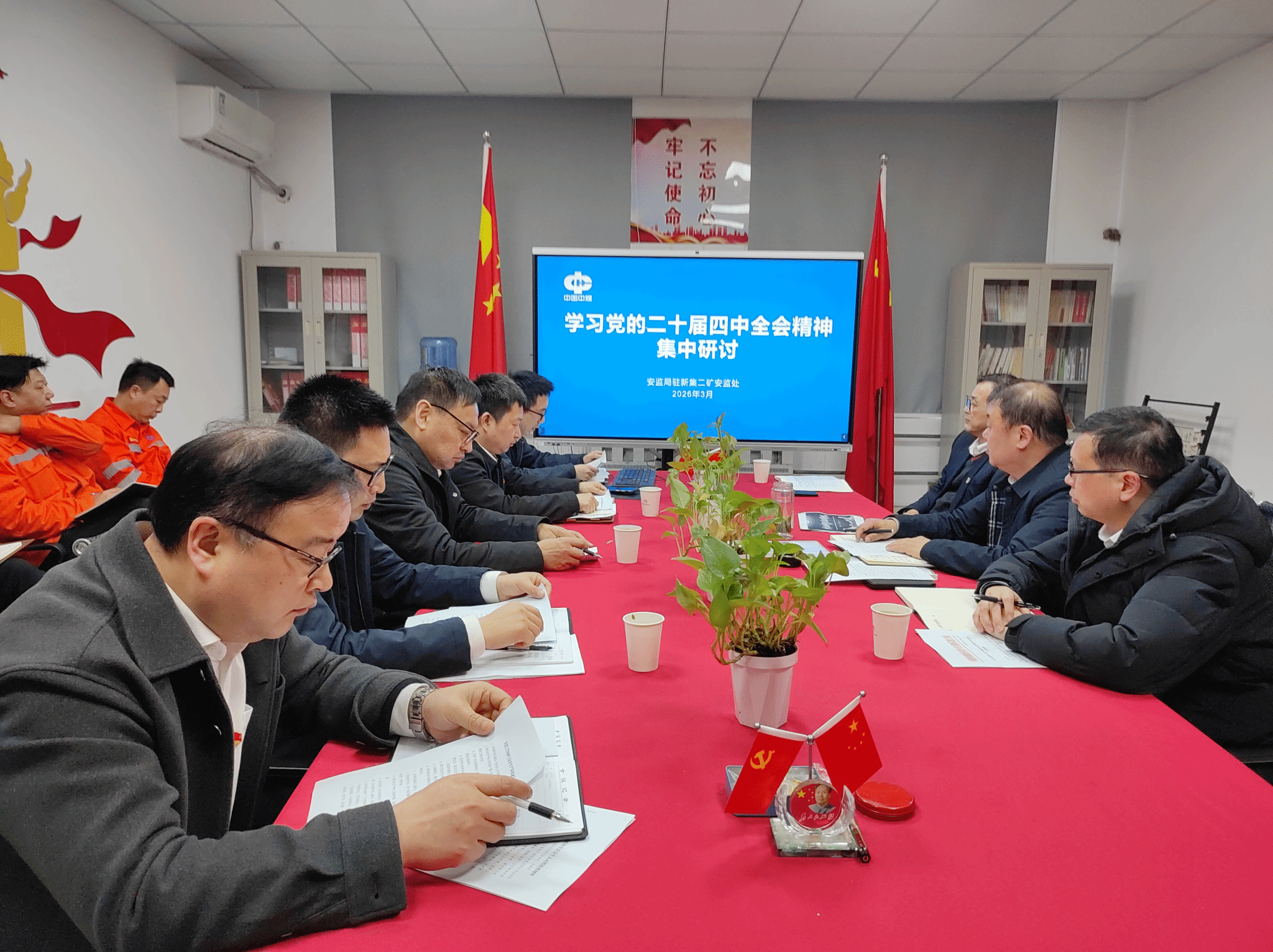 为深入学习贯彻党的二十届四中全会精神,切实把党建引领优势转化为矿山安全监管实效,3月19日,安全监察局驻新集二矿安监处党支部召开学习贯彻党的二十届四中全会精神集中研讨会,全体党员齐聚一堂,围绕党建与安全监管深度融合主题开展深入研讨交流,凝聚思想共识、明晰实践路径,以高质量党建引领矿山安全监管工作高质量发展。