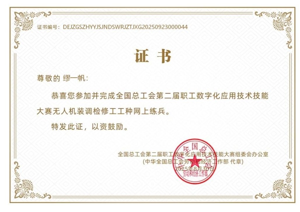 9月24日,滁州发电公司新入职青年员工缪一帆在全国总工会第二届职工数字化应用技术技能大赛中表现突出,荣获”无人机装调检修工”工种网上练兵荣誉证书。此次竞赛聚焦无人机装配调试、故障诊断及智能化检修等领域,全国选手同台竞技,缪一帆凭借扎实的专业基础和实操能力脱颖而出。