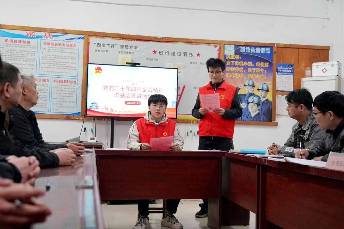 宣讲现场,青年宣讲小分队成员围绕党的二十届四中全会核心要义展开讲解,重点解读了全会审议通过的《中共中央关于制定国民经济和社会发展第十五个五年规划的建议》,深入阐释了“十五五”时期经济社会发展的指导思想、主要目标和重大原则。针对矿业行业特点,宣讲队结合“加快高水平科技自立自强,引领发展新质生产力”等全会部署,将宏大战略与通防区安全生产、技术创新等实际工作相结合,用通俗易懂的语言解读“高质量发展”“科技自立自强”等关键论述。