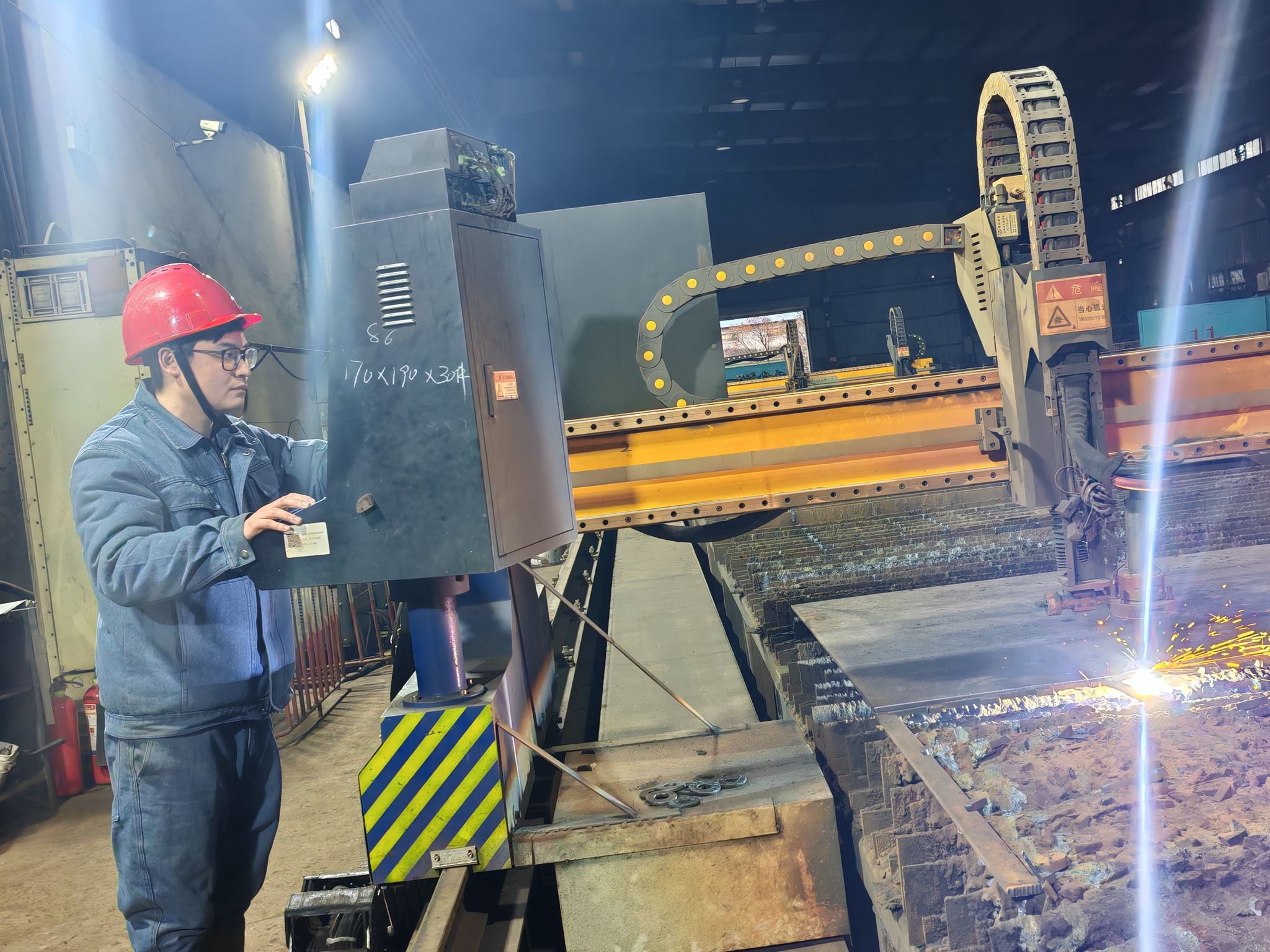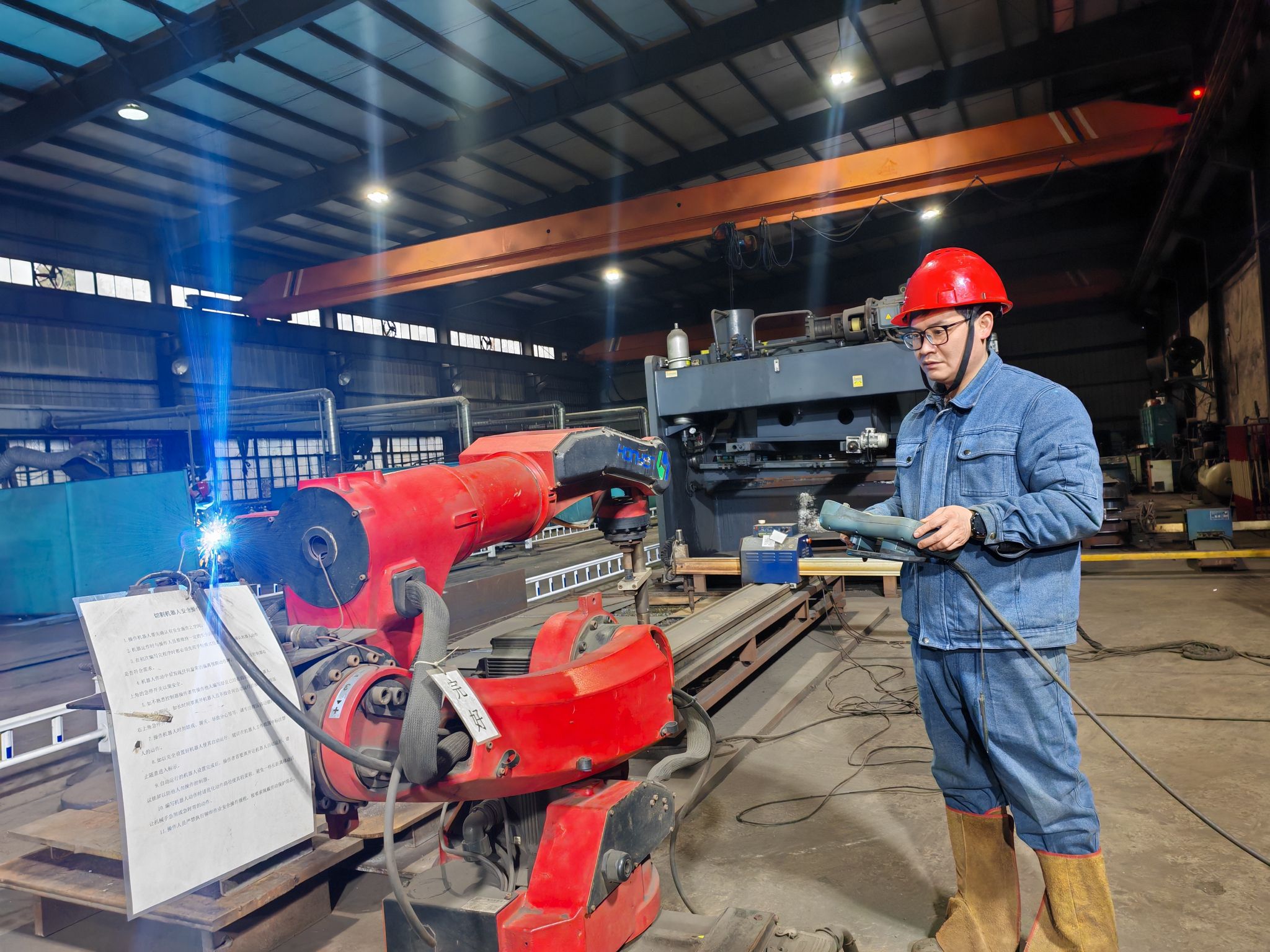 青年接受新事物能力强,新设备焊接机器人引入车间后,爱学习的赵海洋对着新设备反复琢磨,一边研究操作台各种按键功能,一边对着设备原理图分析着,通过他的努力不断试验操作下,焊接机器人便开始运转起来。焊接机械手臂按照图纸设定的路线整齐地焊接,伸缩机械臂在自如地翻转着,焊接枪头在机械手臂的控制下匀速前行,灵活地焊接着工作台面的物件。以往焊接一个结构件需要两三个人配合完成,现在由焊接机器人一次完成,既提高了焊接效率,同时又保证焊接质量。