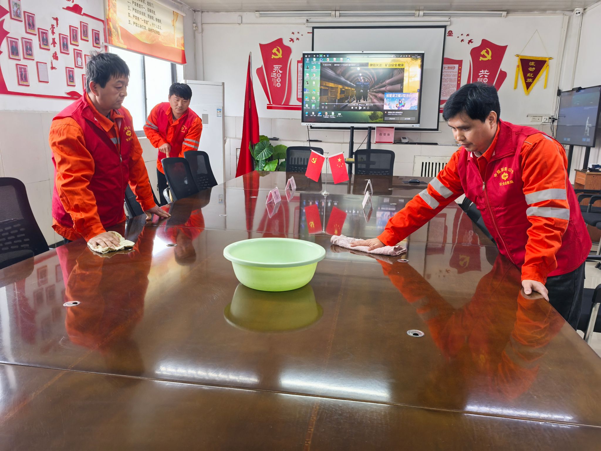 办公区域是守护生产秩序的重要阵地,也是此次志愿服务的重点区域。志愿者们俯身清扫地面垃圾,细致擦拭门窗玻璃与办公桌椅,将办公区域内外整理得井井有条。室外寒风凛冽,室内暖意融融,志愿者们一边清理卫生,一边与值守人员交流,了解日常工作流程,体会一线值守的辛苦。从清晨到日暮,无论是阳光明媚的白昼,还是灯光微亮的傍晚,志愿者们始终坚守服务岗位,用汗水擦亮矿区“窗口”,用行动诠释责任担当。