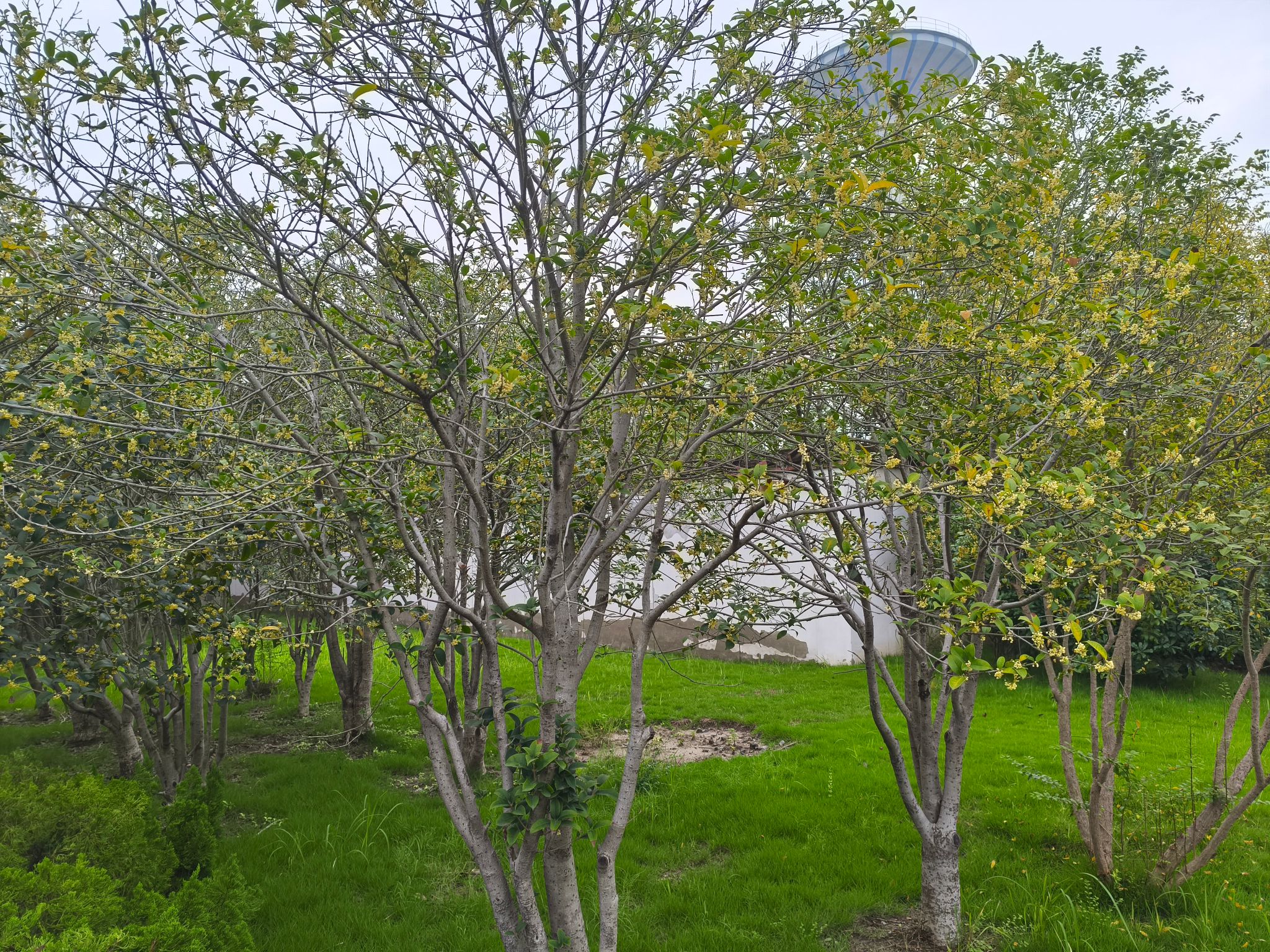 柏油马路被晨露浸湿,鞋底碾过路面的沙沙声,成了伴奏的背景音。行至东边围墙处,忽然被一袭桂香拽住了脚步,绿叶间藏着数不清细碎的米黄,香气扑面而来钻进我的鼻孔,远处的井架犹如钢铁巨人静立在那,少了往日的轰鸣。