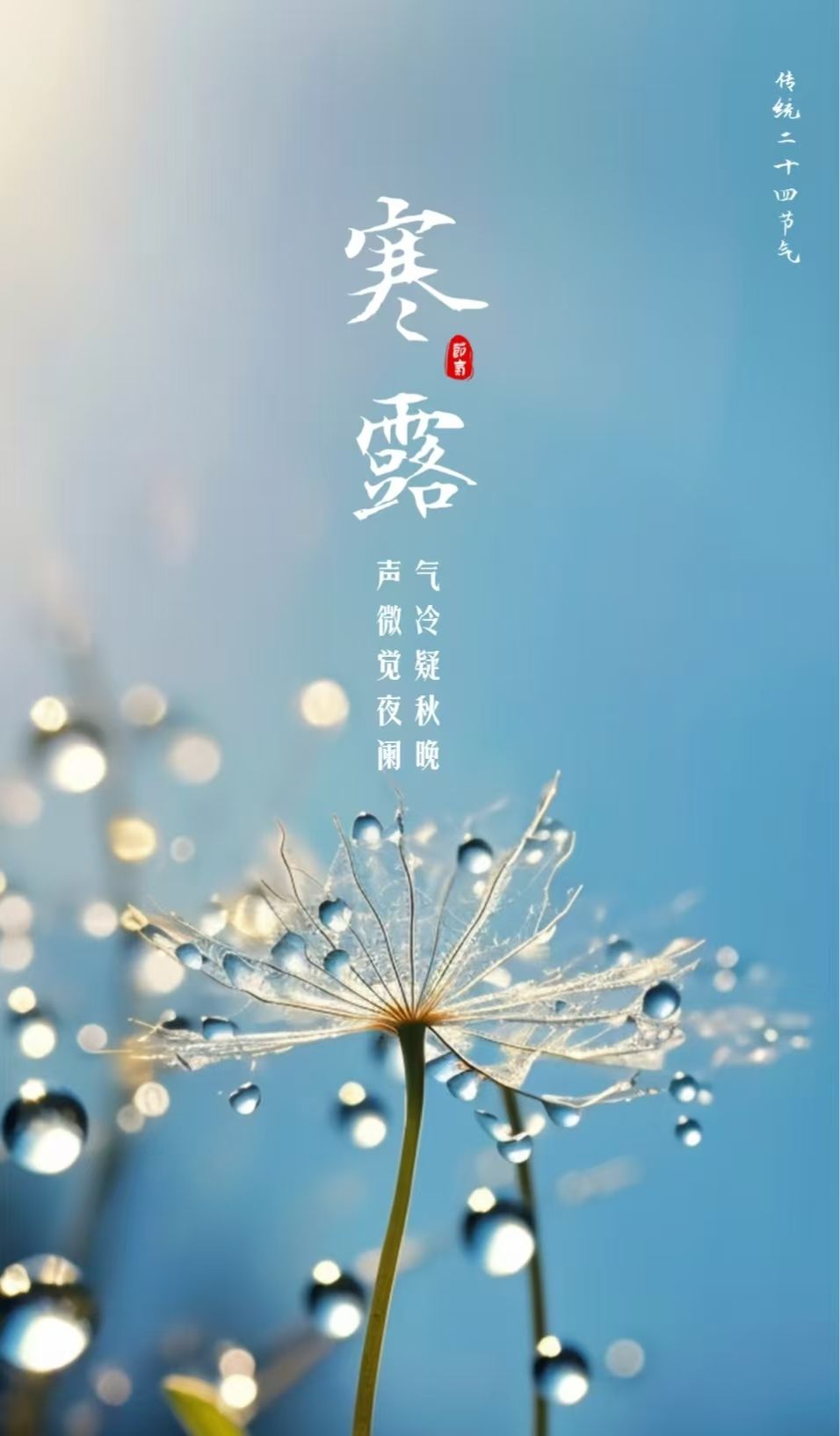九月寒露白,六关秋草黄。寒露,是二十四节气之第十七个节气,秋季的第五个节气。斗指戊,太阳到达黄经195°,在每年公历10月7日至9日交节。“寒露”时期的气温比“白露”时更低,地面的露水更冷,快要凝结成霜了。“寒露”节气是天气转凉的象征,标志着天气由凉爽向寒冷过渡,露珠寒光四射,如俗语所说的那样,“寒露寒露,遍地冷露”。
