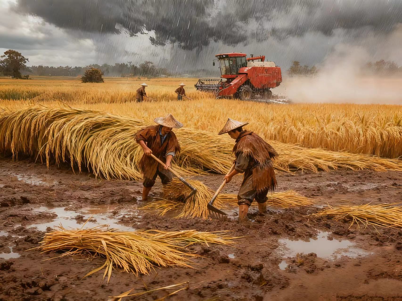 夕阳终于沉进了云层,余晖把天边的灰云染成淡橘色,却没给这片泥泞的田野添半分暖意。农人们再次弯下腰,镰刀划过稻秆的声响、收割机的轰鸣又在田间响起,直到暮色彻底裹住了田野。收割机载着满仓带着湿气的稻谷,车轮碾过田埂时溅起泥花,车斗里的稻子时不时“哗啦”一声滑落几粒,发芽的颗粒混在金黄的稻穗里,像白纸上的墨点,格外刺眼。王老汉跟在车后,脚步虚浮地踩着泥坑,望着车斗里的稻子,喉头动了动,终究没说出话来——他想起春里育秧时的暖光,想起夏里稻苗抽穗时的风,想起往年秋收时晒谷场的金黄,可此刻,只有满田的稻茬和冷透的风,裹着一季的落空。