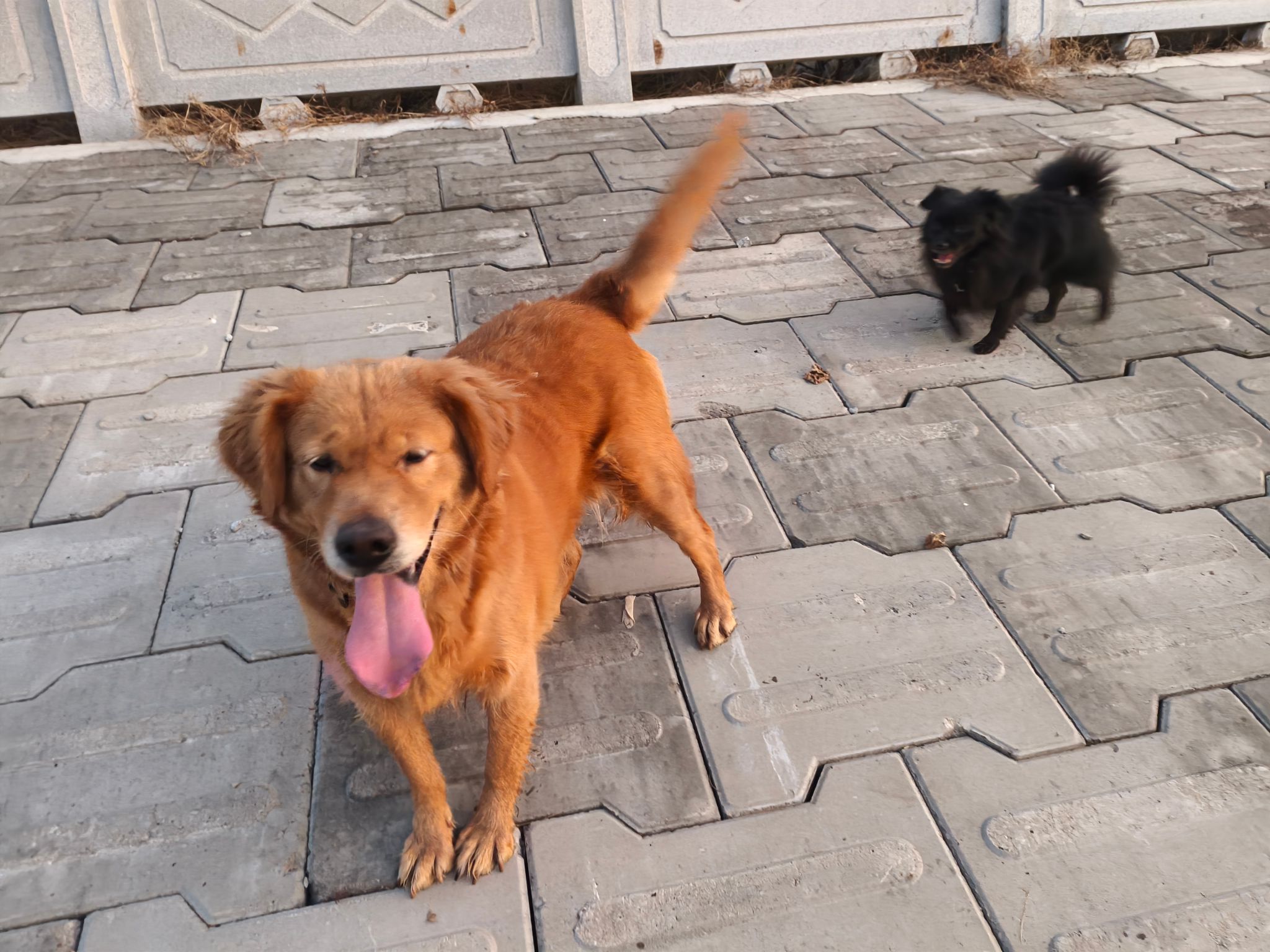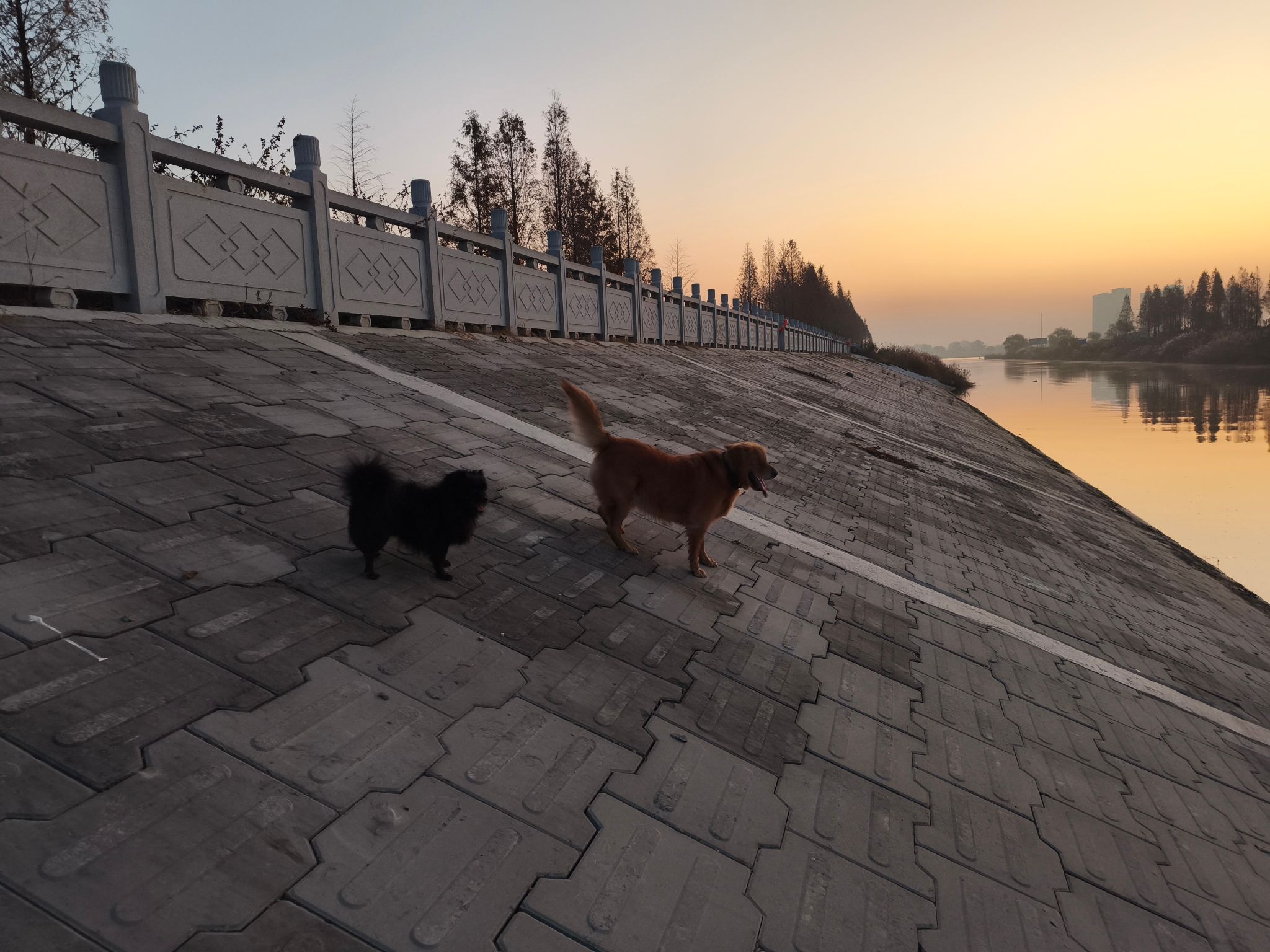 淘淘是那只大黄狗,温顺又活泼,四肢健壮,跑起来风风火火;黑豆则是小巧玲珑的小狗,黏人得很,总爱跟在淘淘身后打转。天还未完全亮透,天边晕着浅浅的鱼肚白,我便牵着它们出门了。一到河畔,解开牵引绳的瞬间,两只小家伙便挣脱了束缚,在河畔的水泥坡地上蹦跳奔跑。淘淘迈着大步,追逐着空中的飞鸟,时而低头嗅闻地面的气息,浑厚的犬吠声打破了冬日的静谧;黑豆则小碎步跟着,时不时蹭一蹭淘淘的身子,偶尔停下脚步,抬头望向我,小尾巴摇得不停,模样惹人喜爱。