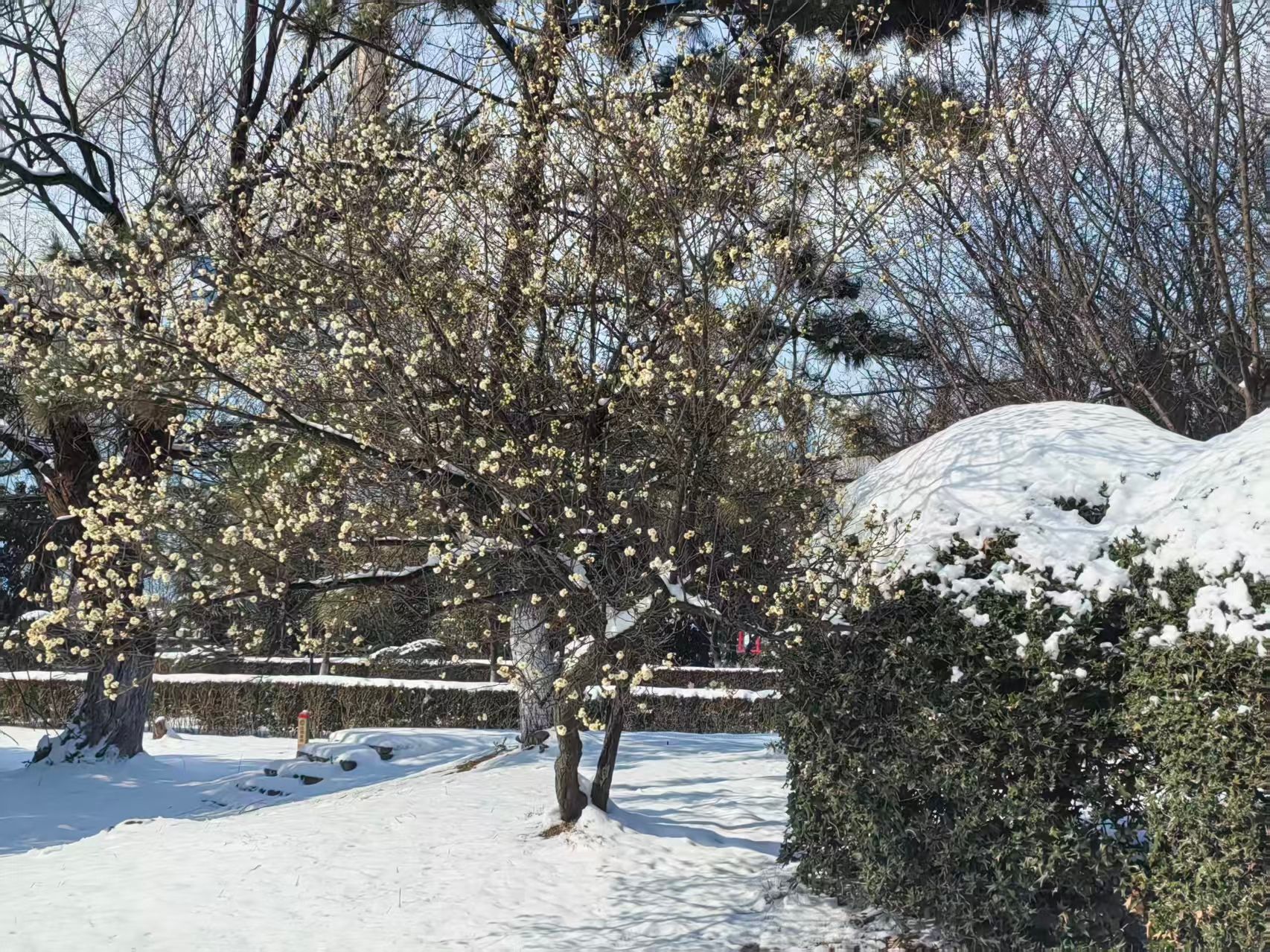 记忆中的它,是矿灯划破深幽地底的灼灼光芒。而此刻,“雪却输梅一段香”,这自《雪梅》中漫出的意境,竟在此处找到了最贴切的注脚。雪,宛如天地缓缓铺展的信笺;梅,则是信笺上最灼灼其华的落款。它们静立于小园一隅,以花的柔软,接住了整座矿山的厚重。这里的梅不似江南的纤柔,浸透了淮北的凛冽与旷达,每一瓣都凝着矿山人“凌寒独自开”的骨气与倔强。