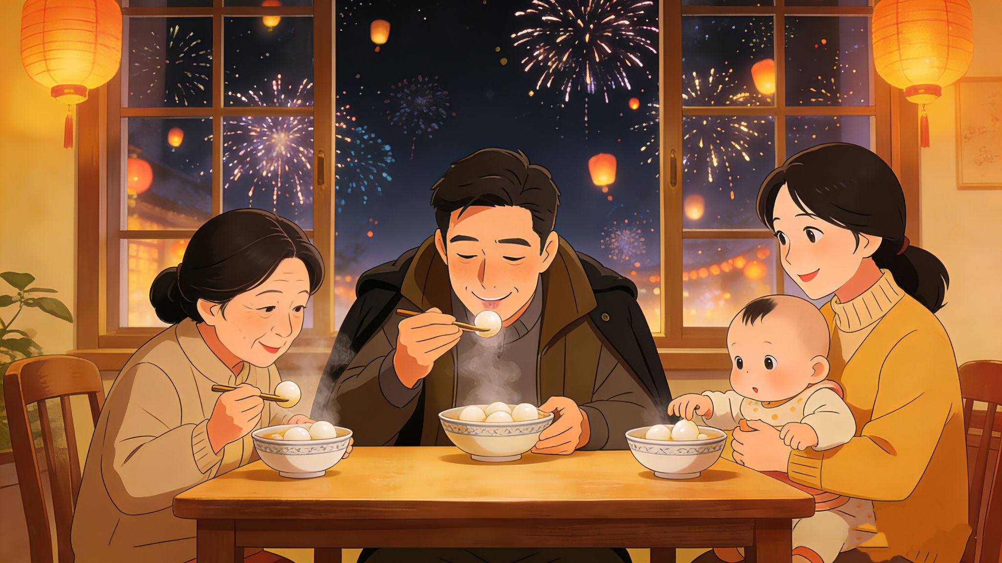 那一刻,我忽然怔住。眼前这小小的身影,像极了当年被父亲捧在手心、护在怀里的我。原来时光流转,爱从未走远,只是从父亲宽厚的掌心,轻轻传到了我的怀中。一碗汤圆,两代童年,三代同堂,便是世间最圆满、最动人的幸福。
