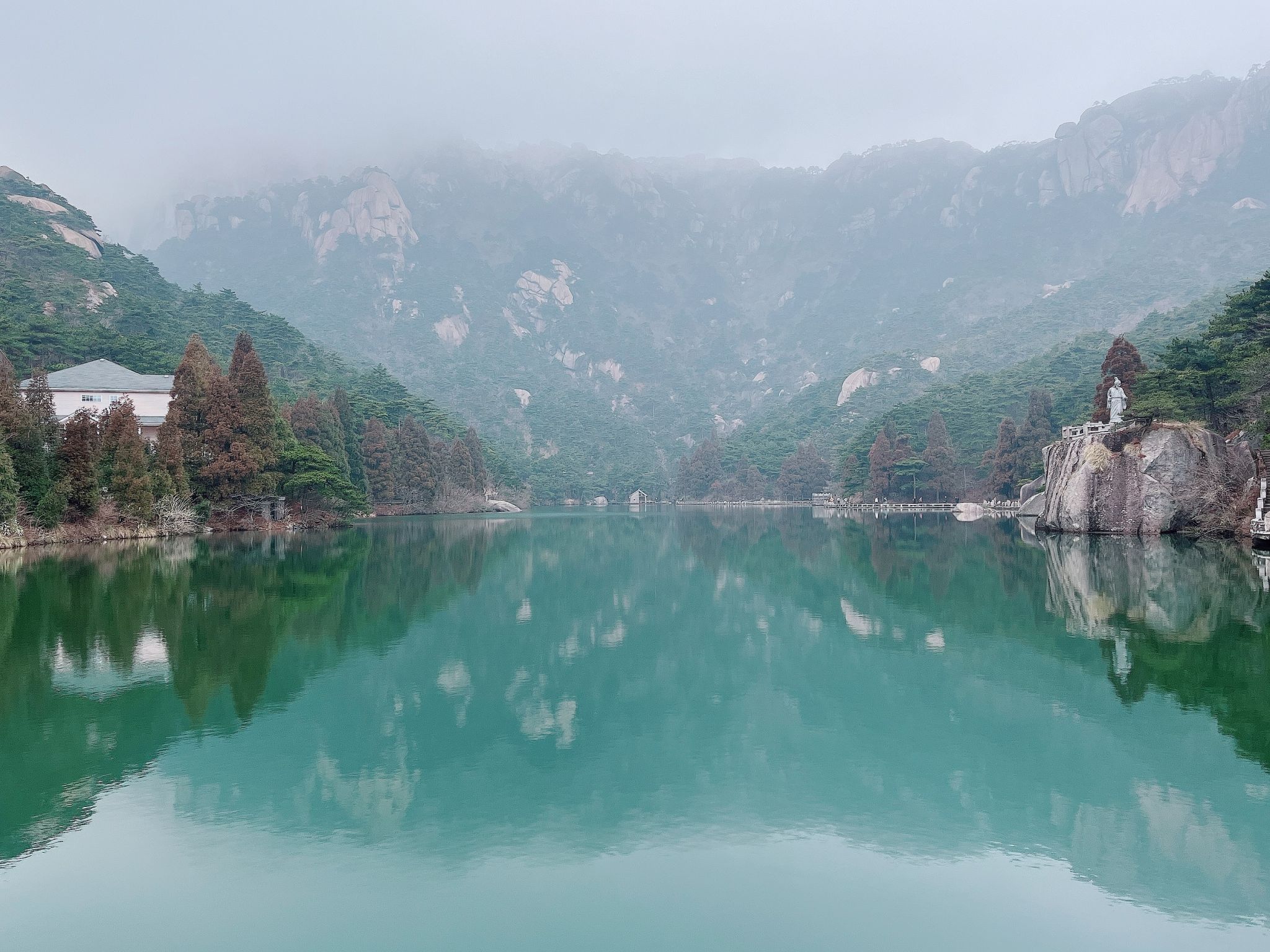 正当沉醉于天柱山的雄奇壮阔之时,目光越过层层叠叠的山峦,向远处望去,一片澄澈的碧水蓦然闯入眼帘,那便是天目湖。与天柱山的阳刚险峻截然不同,天目湖静卧在春日的丘陵之间,温婉如玉,静谧安然。湖水是清浅的碧绿色,像被春日的草木浸染过一般,澄澈透亮,在淡淡的日光下泛着细碎的波光。湖中小岛错落有致,被郁郁葱葱的绿树覆盖,远远望去,如一颗颗翡翠镶嵌在碧玉盘里,偶有白鹭翩跹而过,渔船轻轻划过水面,漾开层层涟漪,没有波澜壮阔,只有岁月静好的温柔。
