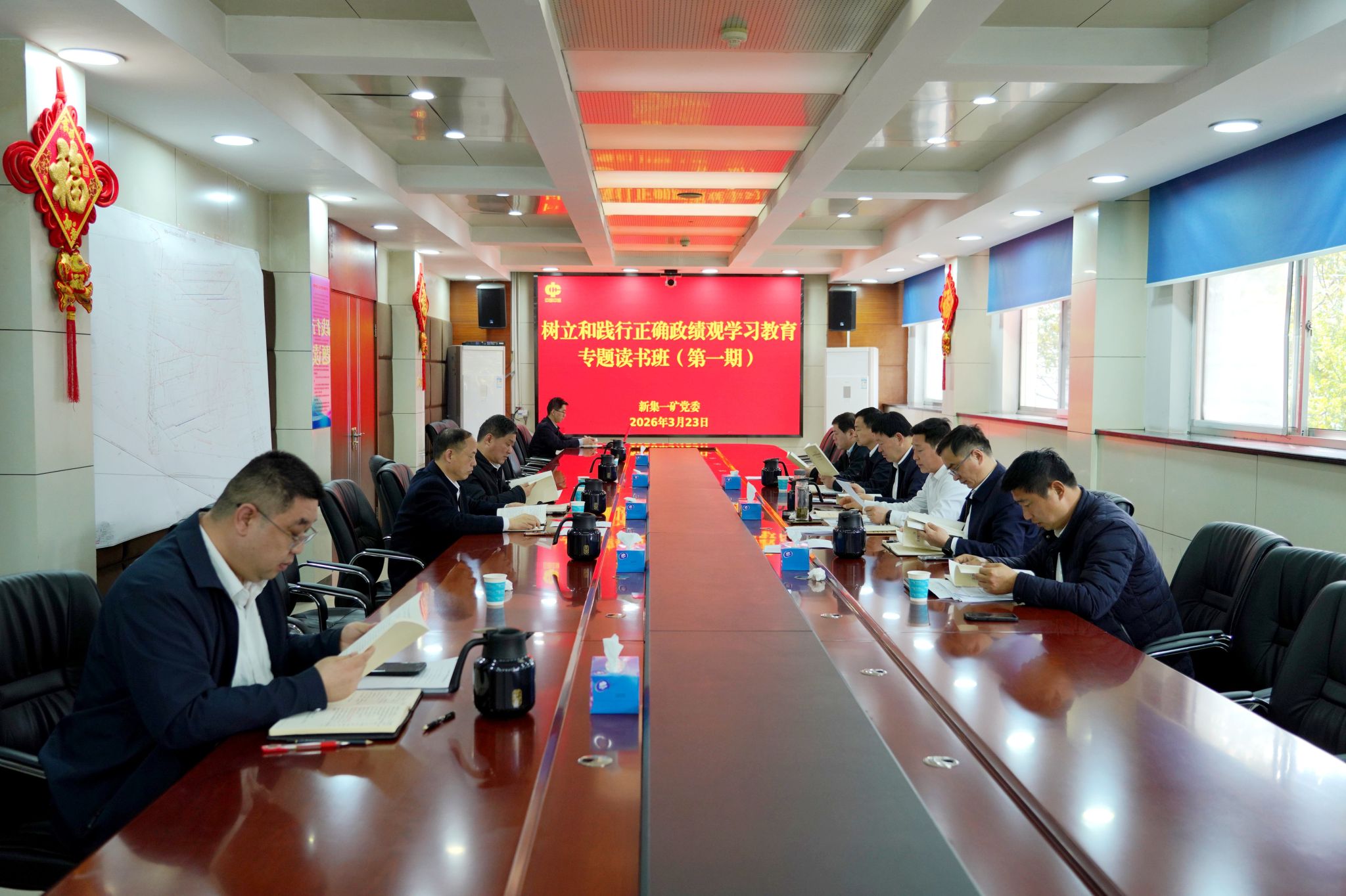 3月23日上午,新集一矿党委举办树立和践行正确政绩观学习教育专题读书班(第一期)。党委书记、副矿长李贯胜主持会议,党委副书记、矿长吴征亮,党委副书记、纪委书记戚良早等班子成员,相关科室负责人参加。