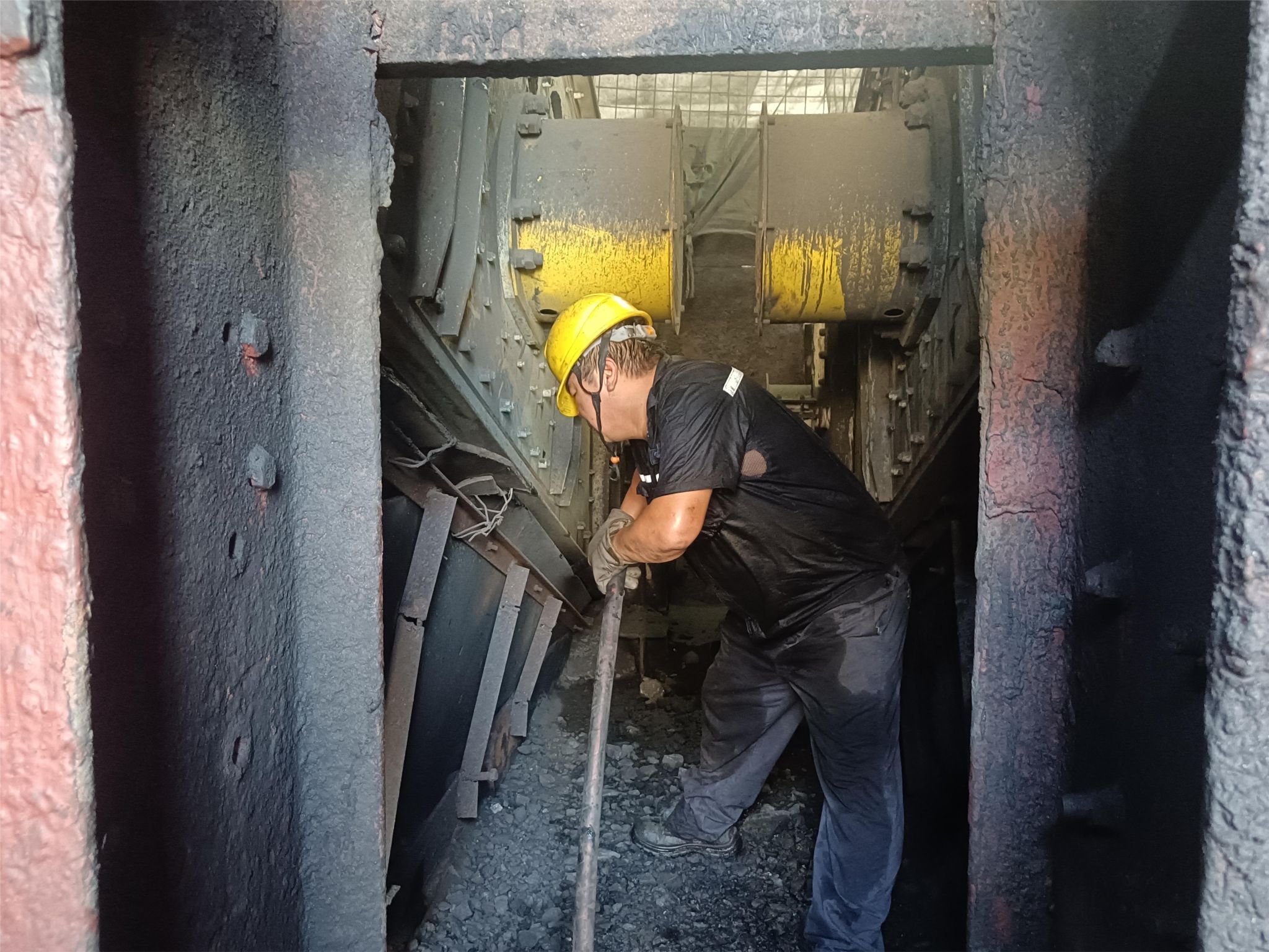 在刺人耳膜的尖啸声中,岗位工老彭紧握风管,一点一点地清理溜槽的积煤、粘煤。由于空间有限,他只能弯着腰进行清理作业,汗水顺着他的脸颊流淌,全身衣服已经湿透,脸上溅满星星点点的煤。老彭顾不得这些,仍在一丝不苟地清理。“只有把溜槽里的积煤、粘煤清理干净,才能保证中夜班正常生产。再热、再累,也值得。”老彭说。