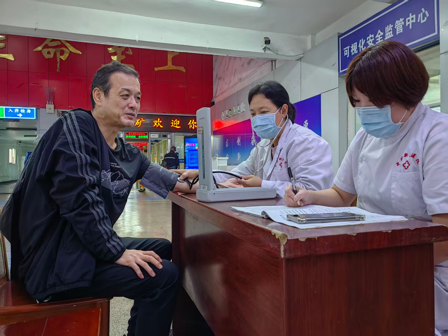 活动现场,保健站医务人员为矿工们提供血压、血糖测量服务,并针对近期体检报告进行细致解读。对矿工提出的“转氨酶指标为何偏高”等疑问耐心解答,不仅说明血压、血糖正常范围,还讲解结节、息肉等影像学结果的临床意义。同时,给出低盐饮食控血压、规律监测血糖、合理作息等个性化健康指导。