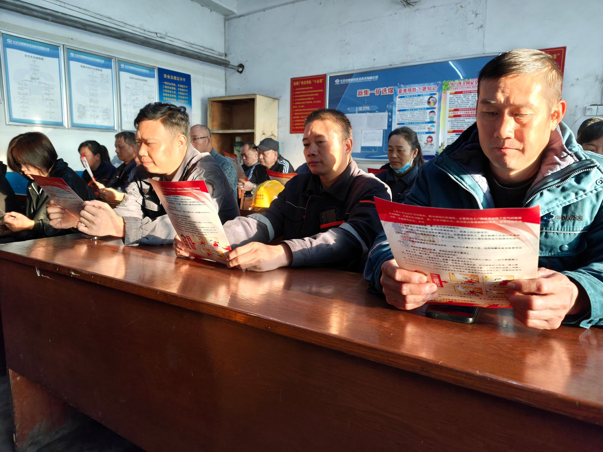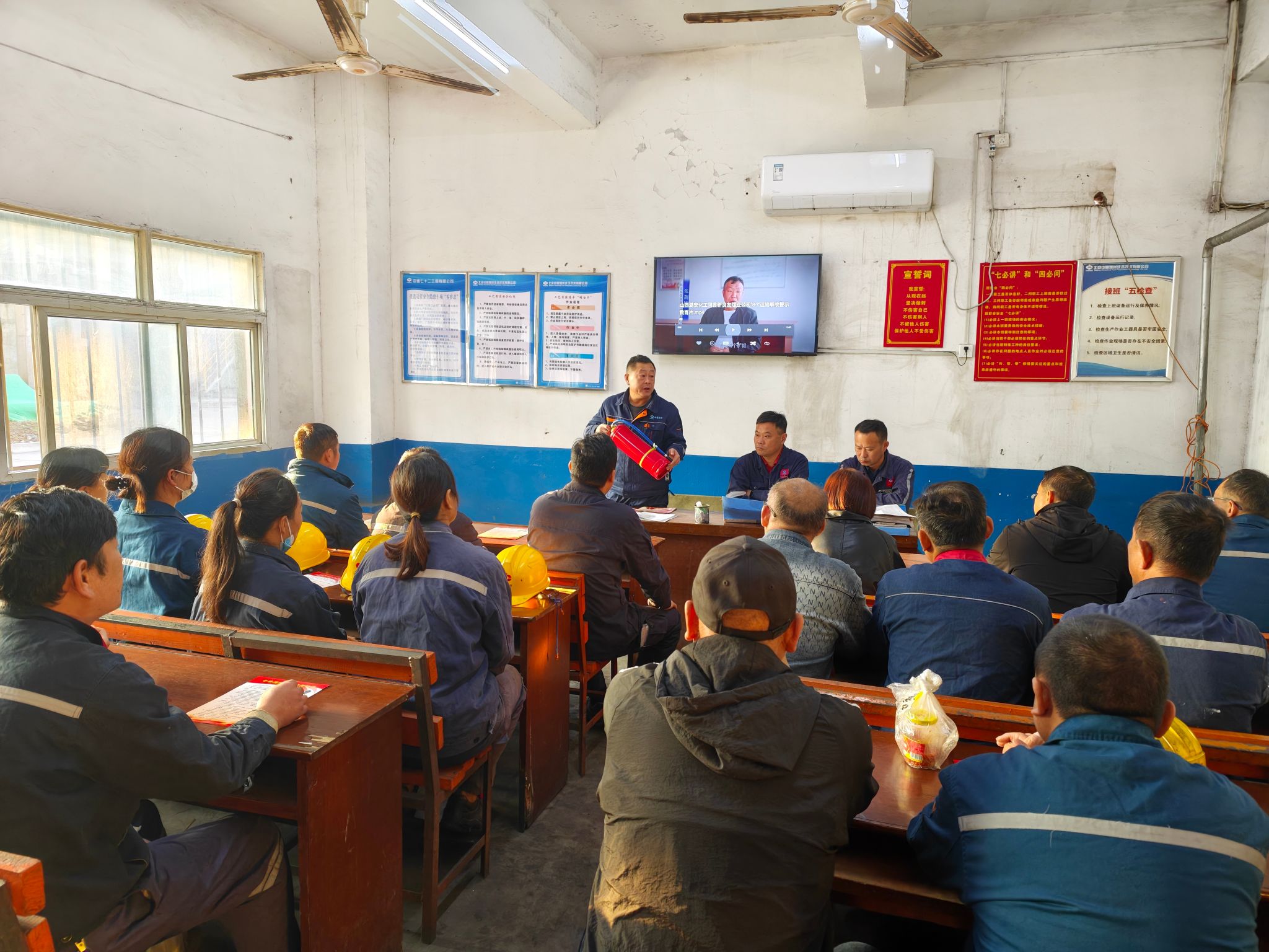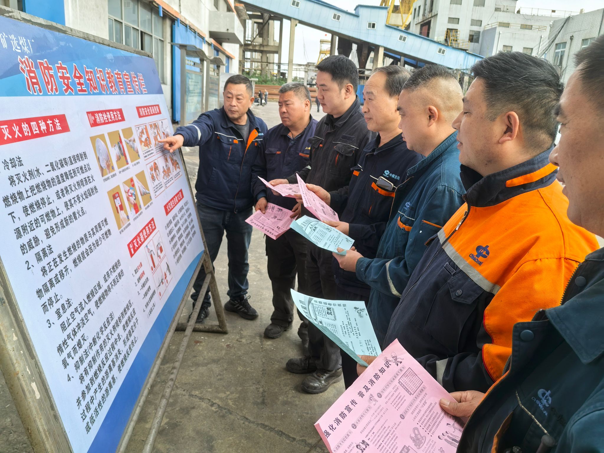 该厂在洗煤车间主厂房门前广场布设消防知识展板,组织职工观看了解消防安全基础知识、火场逃生、自救等知识。安排人员深入基层车间班前会议室,向职工们发放消防安全知识宣传单,示范讲解灭火器等消防器材的正确使用、检查和维护方法,切实掌握基本消防知识和灭火技能。