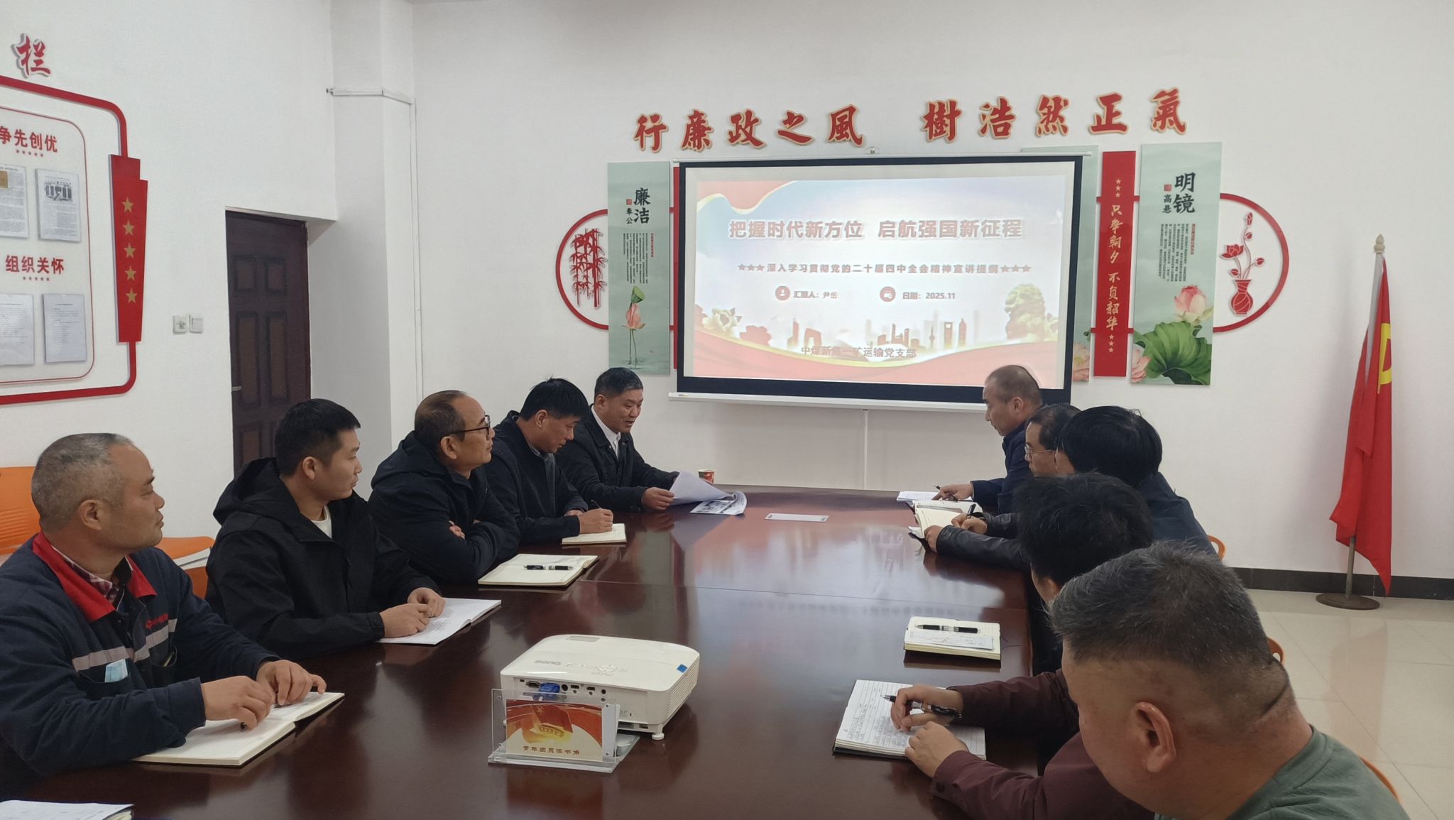 讲课以《把握时代新方位 启航强国新征程》为题,围绕党的二十届四中全会核心要义、精神实质和实践要求,结合煤矿行业发展趋势与矿井运输工作实际,从“深刻把握全会对基层治理的新部署”“找准党建与安全生产的结合点”“以制度创新赋能运输保障提质”三个方面进行了细致深入讲解。讲课指出,党的二十届四中全会明确的各项改革任务,与矿井安全生产、民生保障、队伍建设等工作紧密相关,运输党支部党员干部要将全会精神转化为攻坚克难的实际行动,在设备升级、流程优化、隐患排查等工作中勇挑重担,以党建"红色引擎"驱动运输工作高质量发展。讲课要求大家要始终绷紧纪律规矩这根弦,筑牢思想防线、严守制度底线,在物料转运、设备检修、工资工分等关键环节上做到公正用权、廉洁用权;要自觉接受群众监督,主动排查岗位廉政风险点,以“零容忍”态度抵制不正之风;要发挥先锋模范作用,带头践行“安全第一、预防为主”的理念,在廉洁自律、安全生产中走在前、作表率,以过硬作风保障矿井运输安全畅通。
