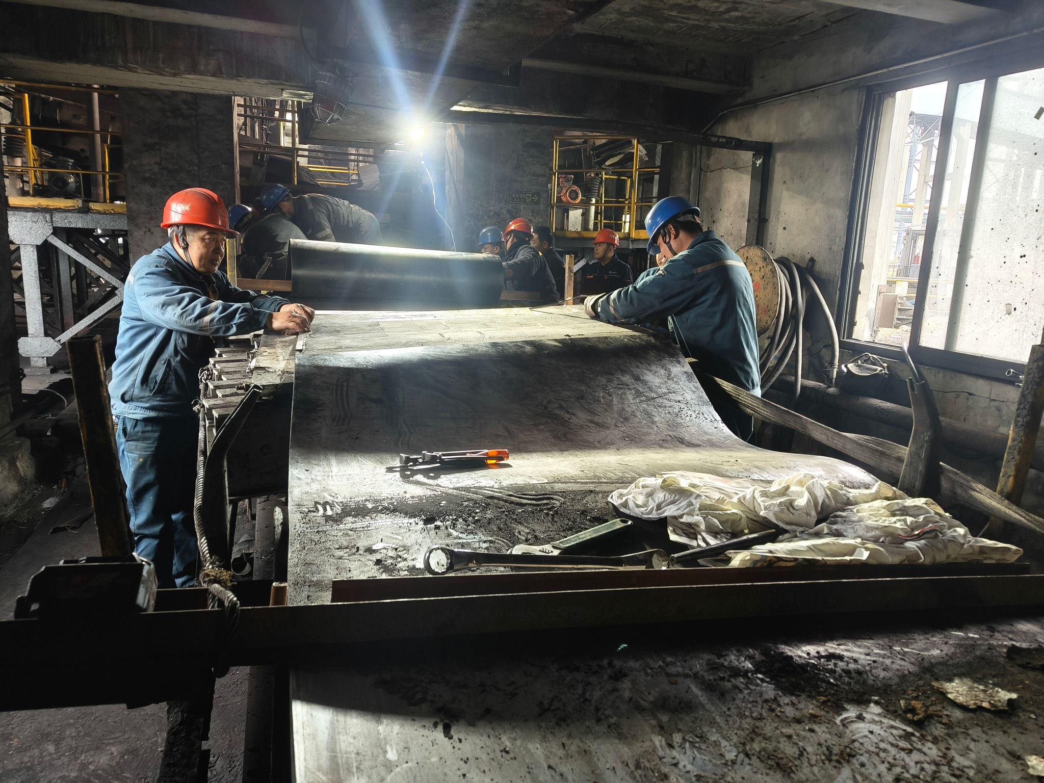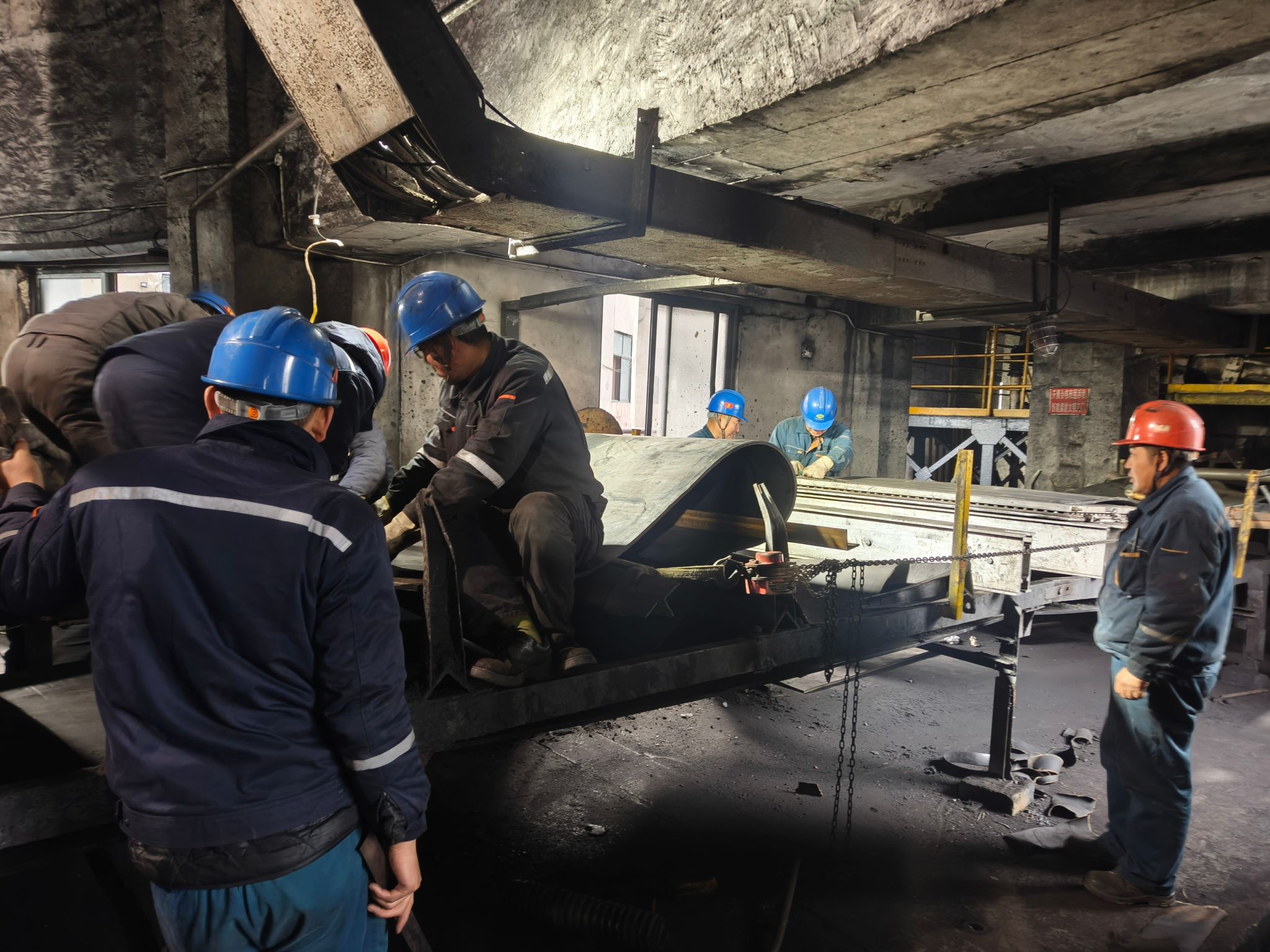 在技术人员的指挥下,全体检修人员迅速投入战斗:拆卸旧皮带,对接新皮带,硫化粘合接头……大家充分发扬新集人吃苦耐劳、敢于拼搏的精神,分工协作、攻坚克难,比计划时间提前3小时完成了新皮带更换工作。经调试,皮带运转平稳流畅,完全满足生产需求。