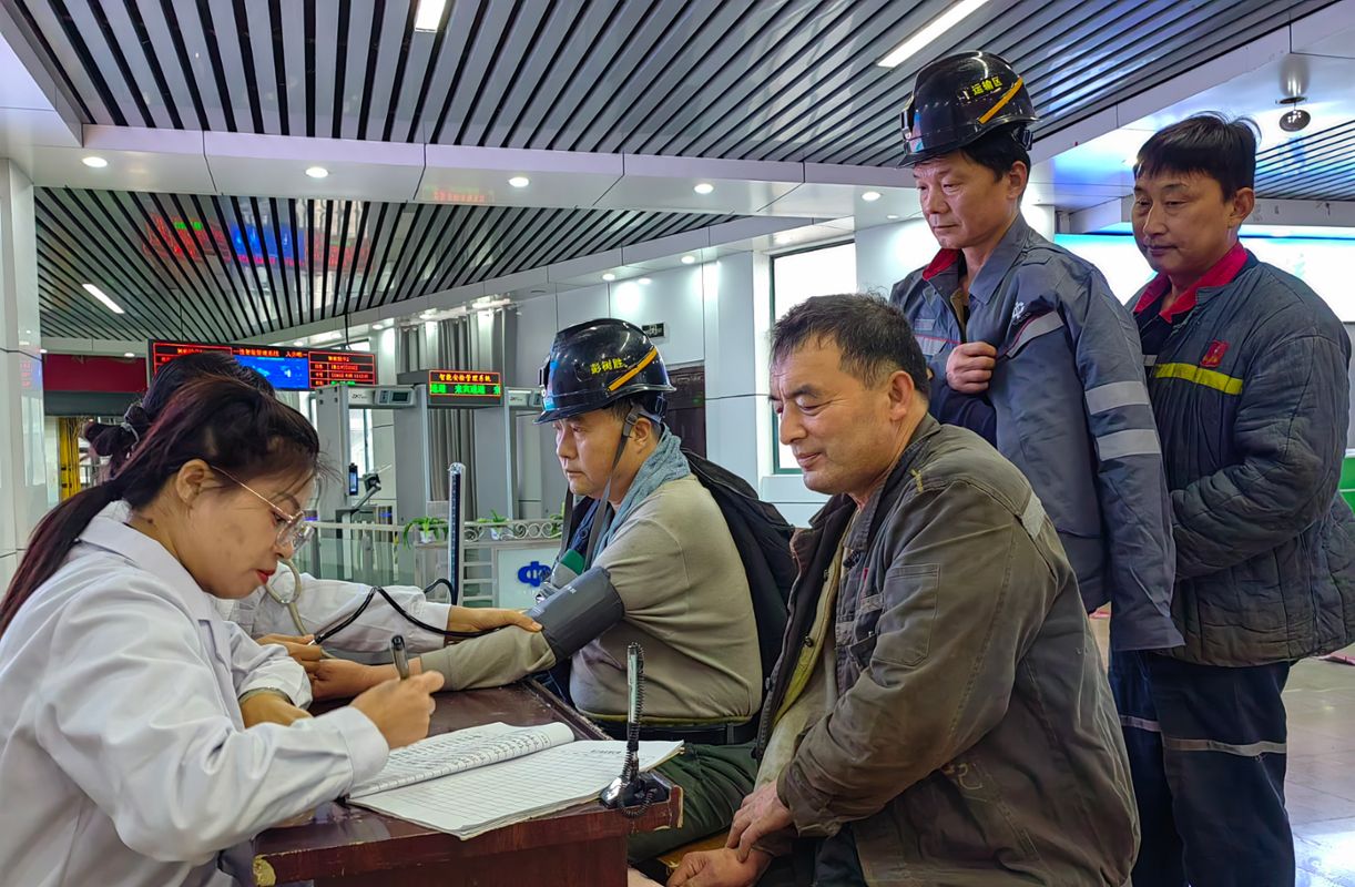 保健站医护人员设立临时检测点,为即将下井的职工逐一测量血压、检测血糖,细致筛查“不放心人员”,并为职工建立健康档案。对于检测指标异常或已知患有相关慢性病的职工,医护人员现场进行健康提醒与用药指导。