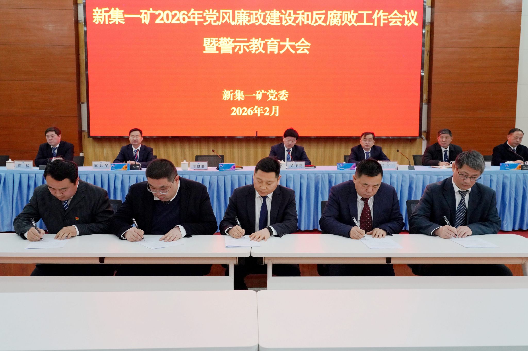 2月10日上午,新集一矿在多媒体会议室召开党风廉政建设和反腐败工作会议暨警示教育大会。党委书记、副矿长李贯胜与基层党支部书记代表签订《党风廉政建设责任书》并作总结讲话;党委副书记、矿长吴征亮主持会议;党委副书记、纪委书记戚良早作新集一矿2026年党风廉政建设和反腐败工作报告;党委委员、总工程师岳喜占传达贯彻集团公司及公司党风廉政建设和反腐败工作会议暨警示教育大会精神;党委委员、副矿长崔猛通报典型案例。
