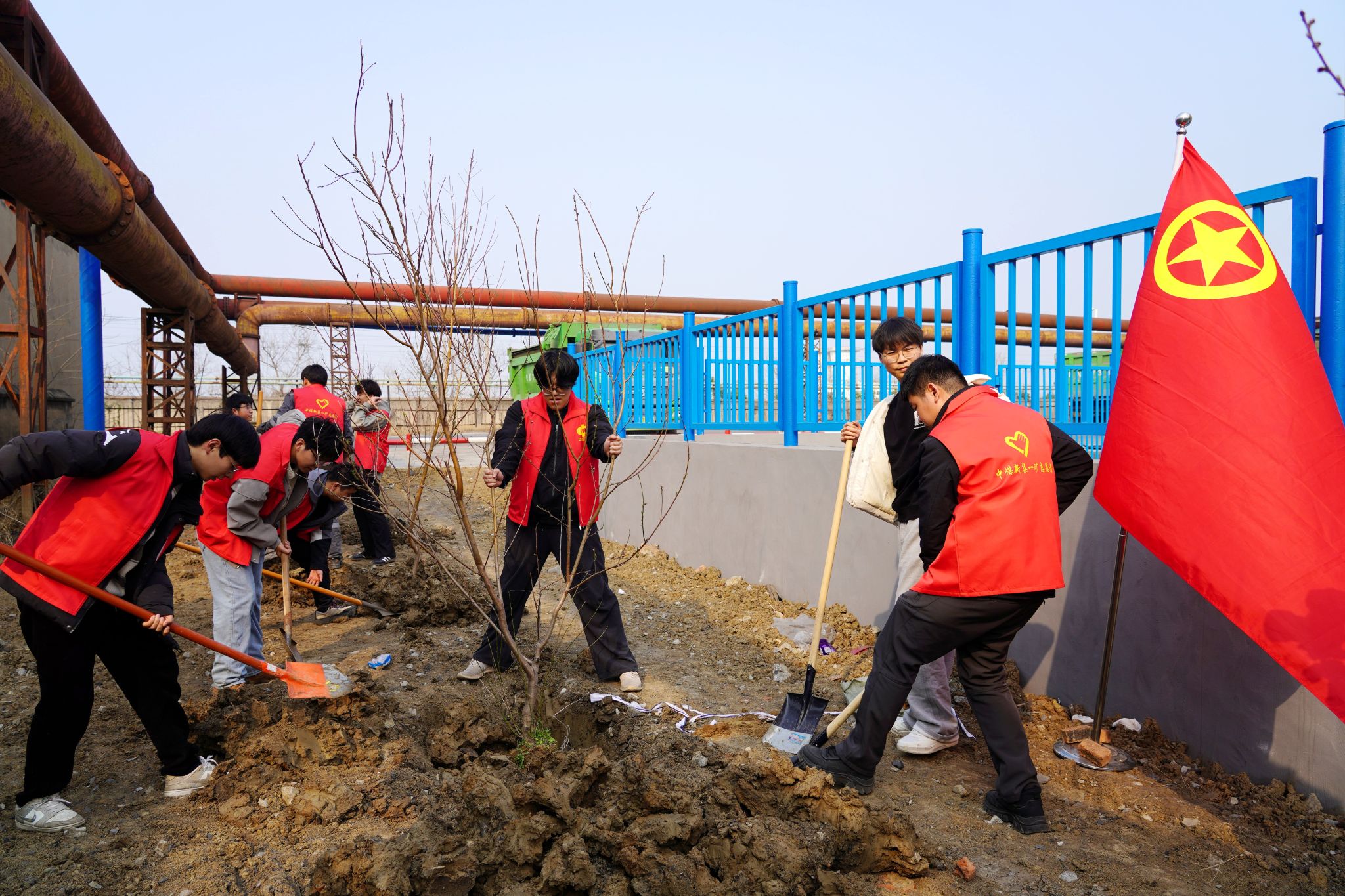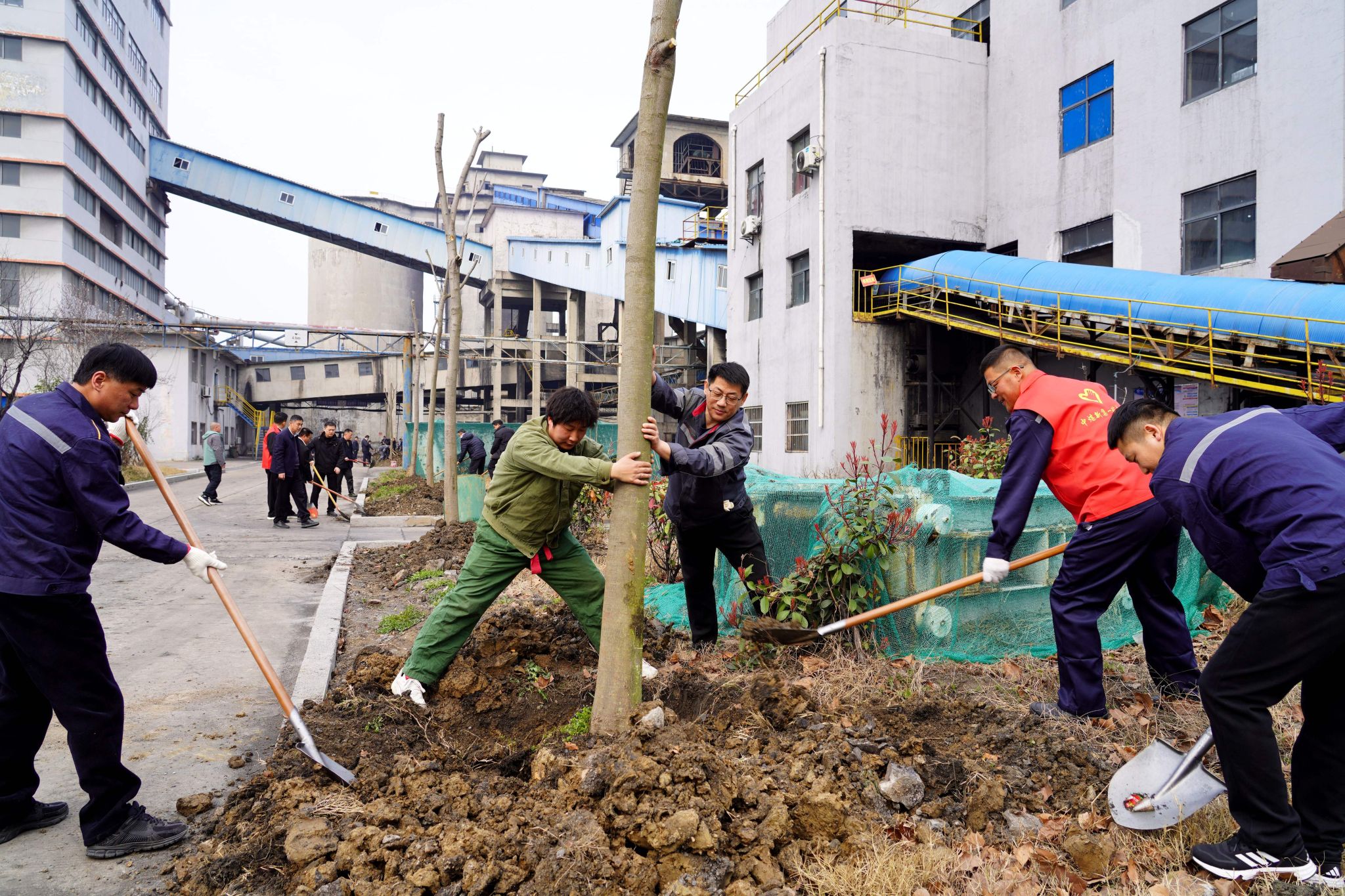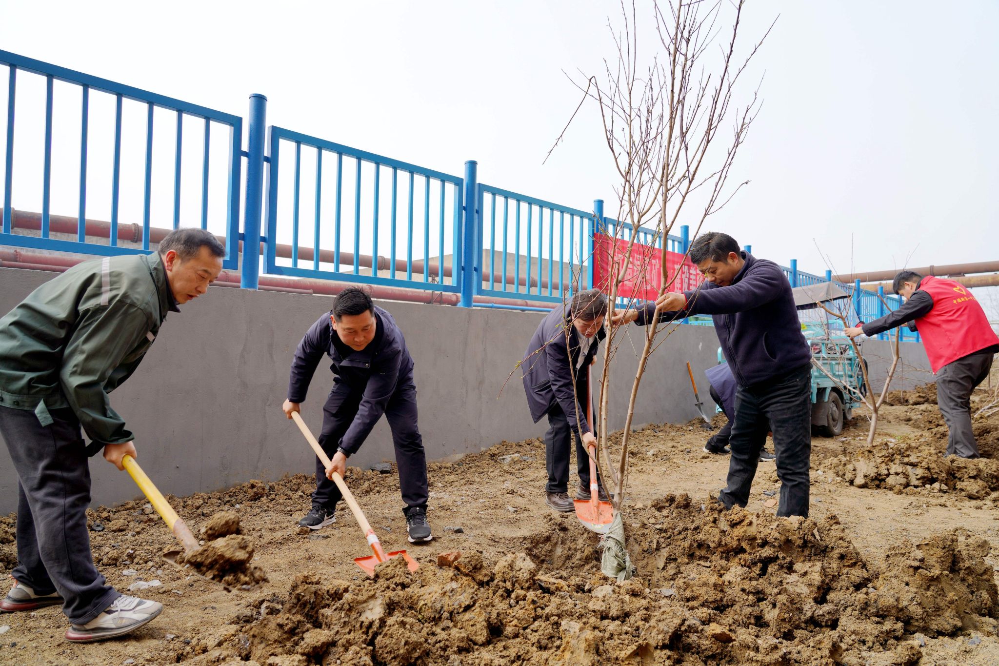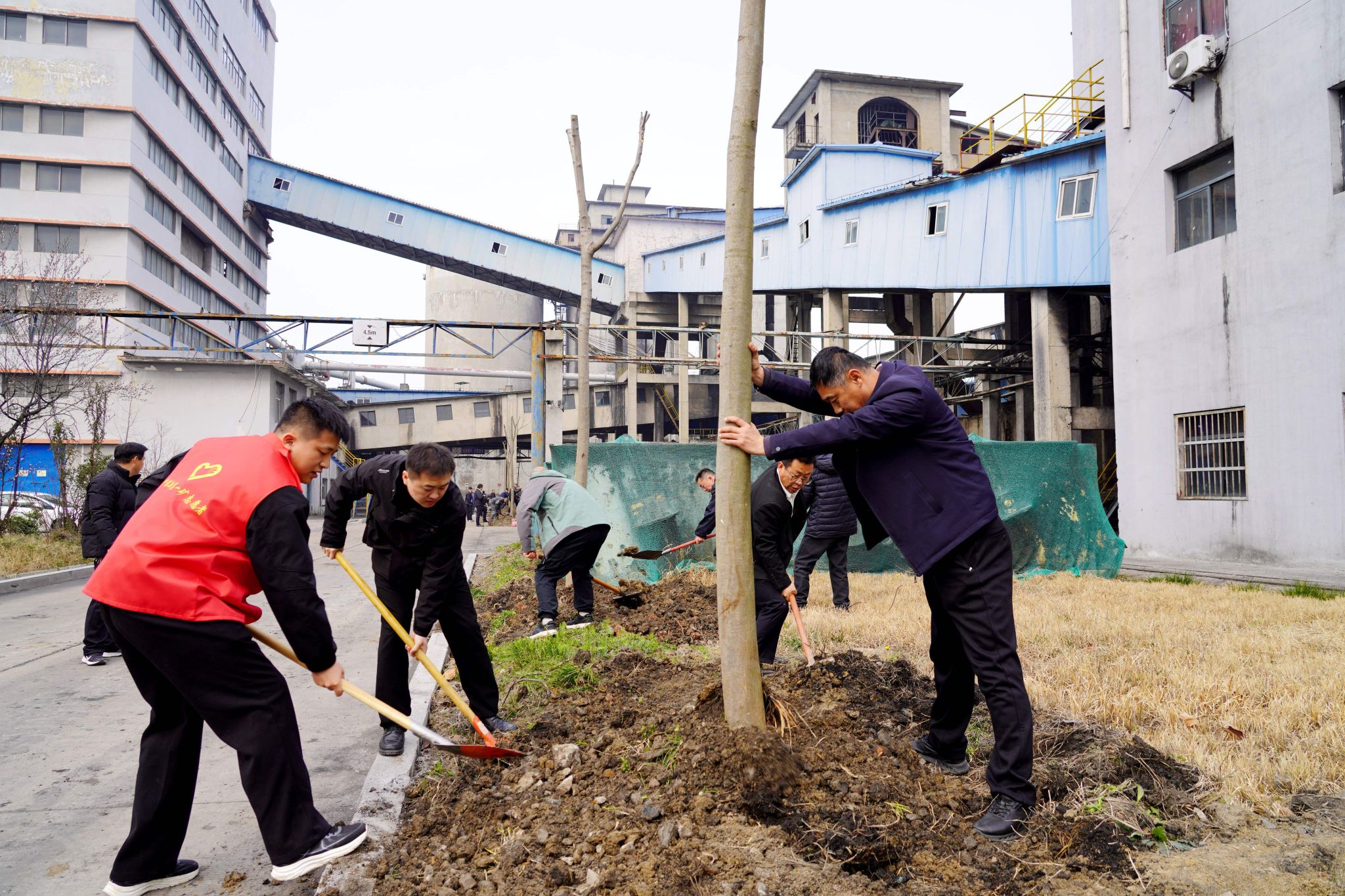 在选煤厂主厂房东侧和中煤仓西侧两处活动现场,矿领导带头挖坑、培土,各单位参加植树人员和青年志愿者也争先恐后,按照事先划分的包干区域马上行动了起来。大家或三五成组,或两两结对,有条不紊地进行栽树、培土……现场一片热火朝天的忙碌景象。在大家的共同努力下,百余棵桃树、栾树和红叶石楠顺利“安家落户”,为矿井再添一抹春色。