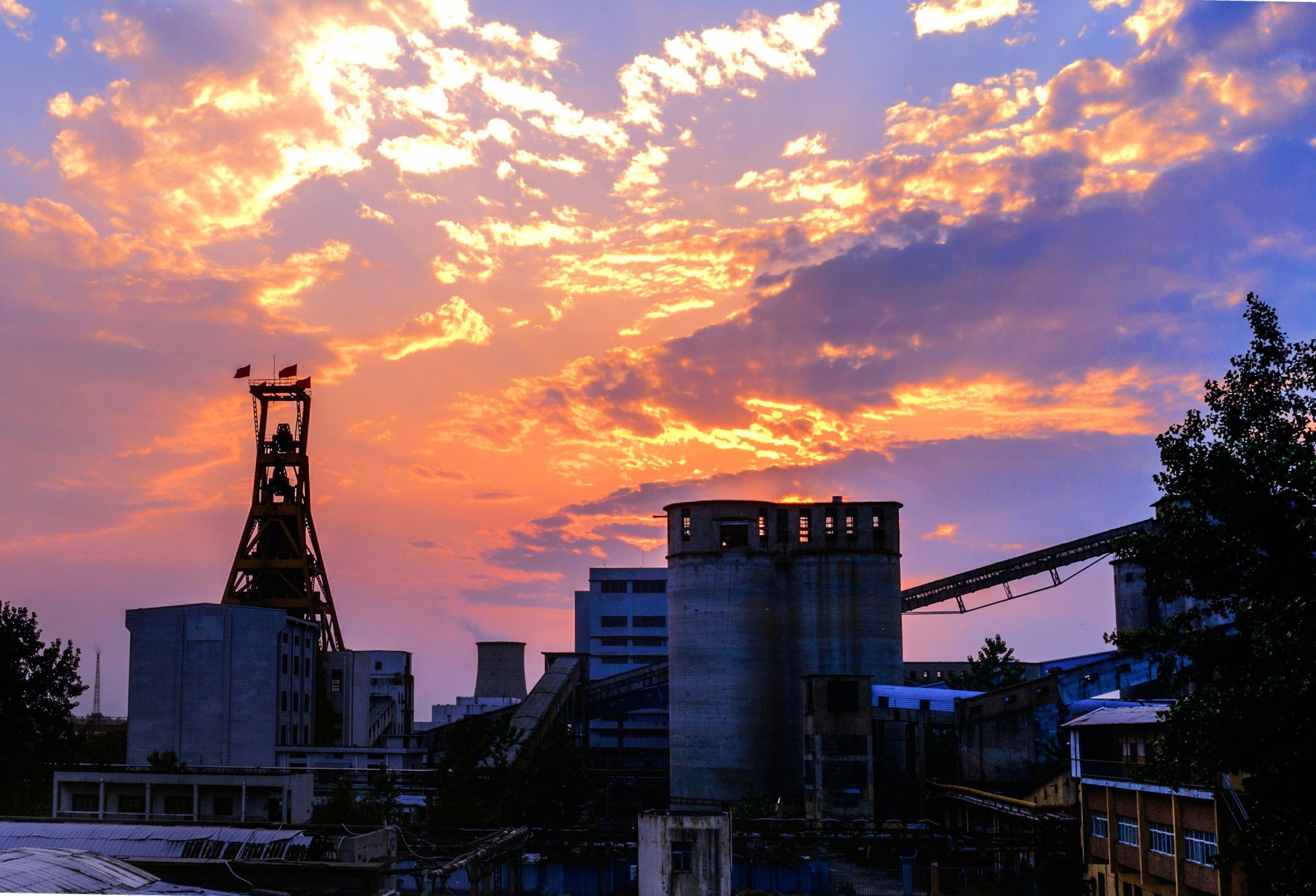 夜晚,绚烂晚霞映照下的混合井井架、选煤厂煤仓、和栈桥如同剪影一样显得非常美丽。
