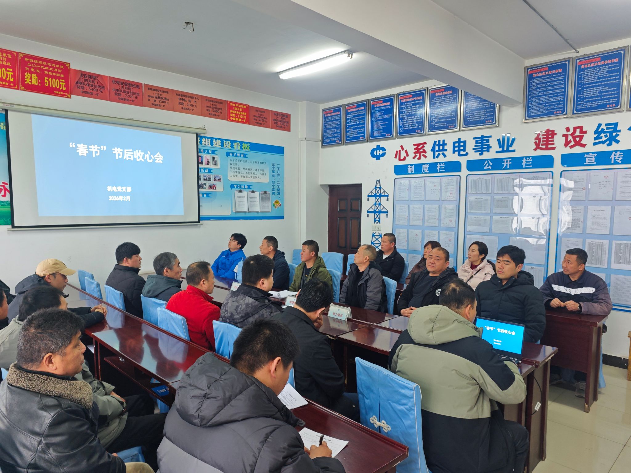2 月 27 日,新集一矿机电党支部利用所辖单位供电队安全会时间组织全体职工开展节后收心暨安全教育活动。
