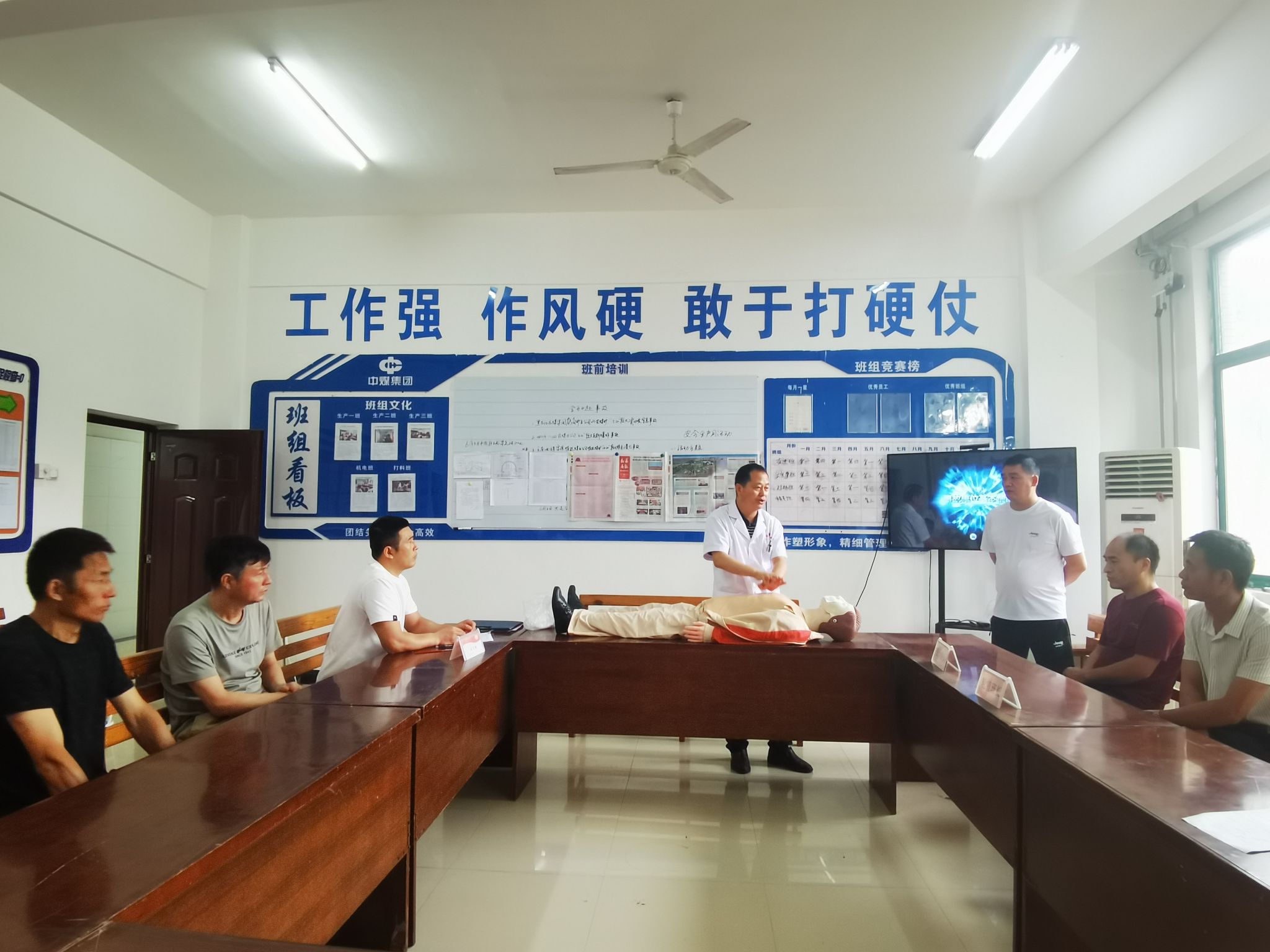 为增强职工健康防护意识,提升急救技能水平,9月3日,新集一矿职防办联合保健站医护人员深入掘进二党支部辖区班前会开展高温天气急救知识培训活动。本次培训活动聚焦高温天气下的健康防护及应急救护技能,内容涵盖防暑降温知识科普、心肺复苏术(CPR)实操演练及常见意外伤害处理等方面。
