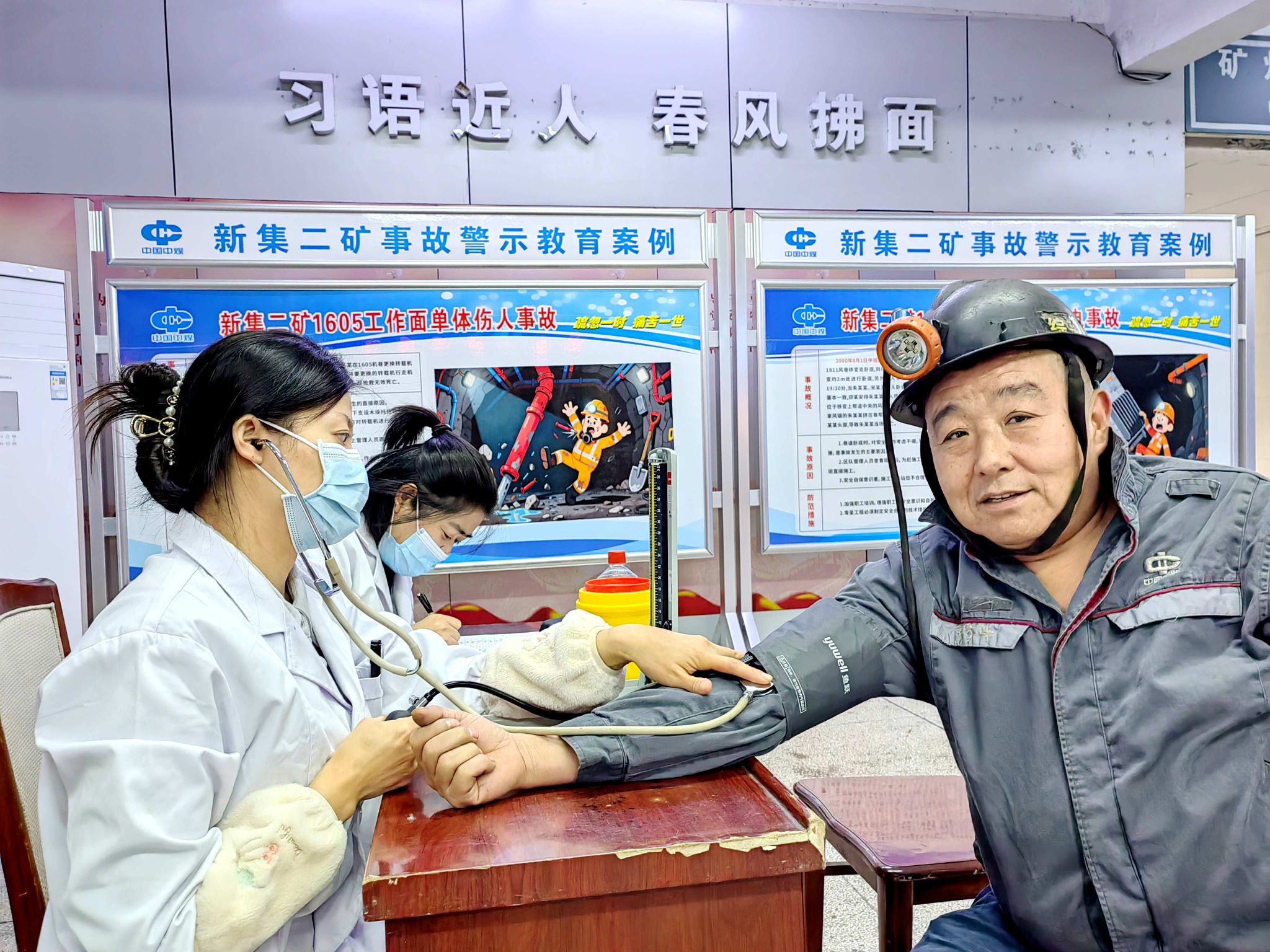 11月5日,新集一矿保健站医务人员到井口等候大厅,为上下井的职工开展健康排查活动,为安全生产筑起一道坚实的健康屏障。
