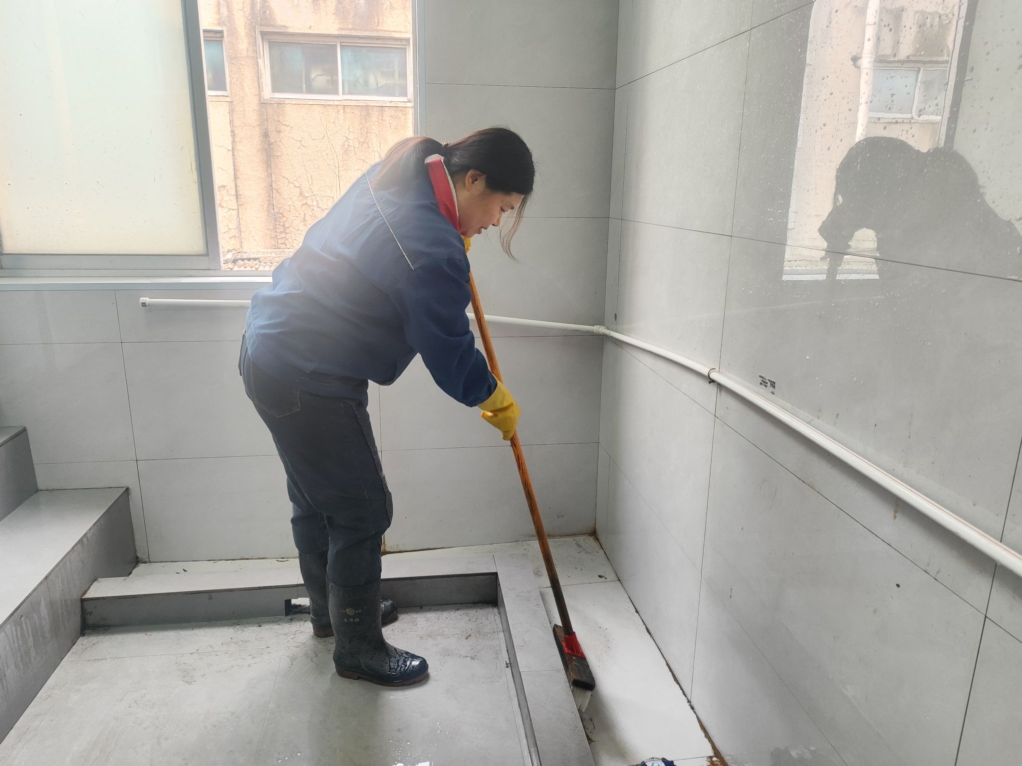 作为新集物业部保洁队的一员,陈冠鲜的工作没有惊天动地的壮举,却藏着对矿山最朴实的温情。她的工作阵地,是生产楼的每一个角落,卫生间、楼道、走廊,这些看似不起眼的地方,却是她日复一日用心守护的“责任田”。微熹初露时,她便到岗开始工作,从清洗工具到细致清扫,每一个步骤都一丝不苟;直到夜幕降临,确认所有区域都整洁如新,她才结束一天的忙碌。夏天,楼道里闷热难耐,不一会儿便汗流浃背,衣衫被汗水浸透又风干;冬天,冷水刺骨,双手洗得通红,她却从没有一句抱怨,“这就是我的工作,干一行就得把它干好”,简单的话语,是她对岗位最坚定的承诺。