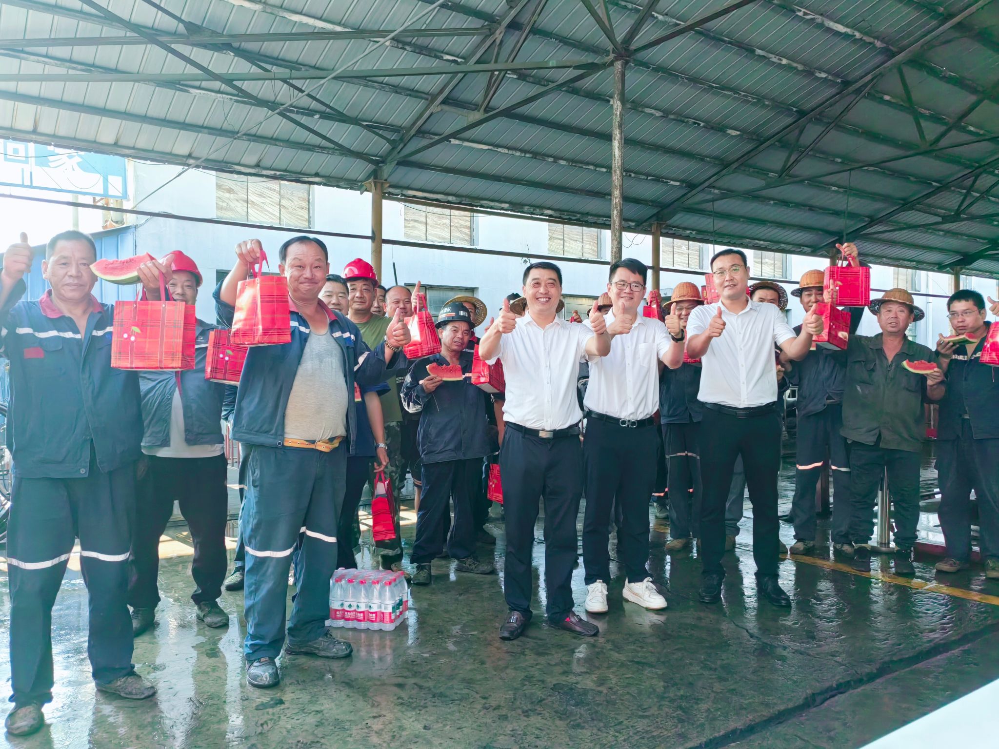 一份清凉,一份牵挂。在运输机电检修车间,运输区管理人员为地面岗位作业人员递上现切的西瓜,把精心准备的矿泉水、盐汽水、清凉包等防暑物资送到职工手中,并反复叮嘱大家注意防暑降温、错峰工作、合理休息,将身心健康放在首位,为矿井安全稳定发展和家庭幸福提供坚实保障。
