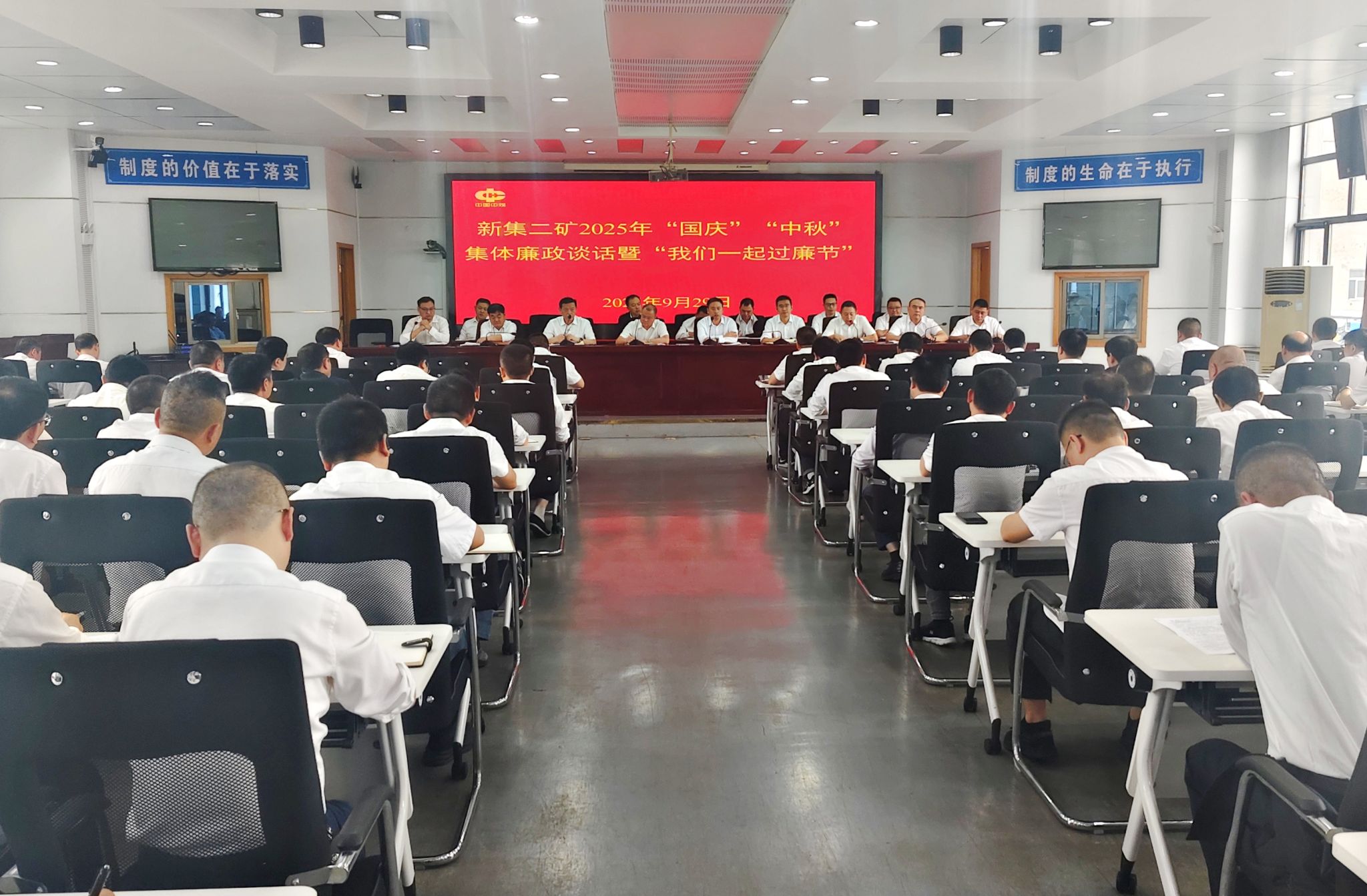 9月29日,新集二矿纪委在行管楼第一会议室开展2025年“国庆”“中秋”集体廉政谈话暨“我们一起过廉节”,矿副主管级以上管理人员参加。