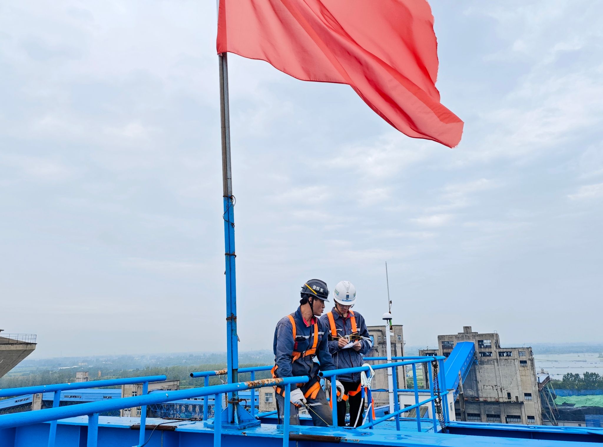 在高耸的井架平台上,该队检修班长手持仪器,目光专注地测量各项关键数据,每一个读数都力求精准;一旁的技术人员则紧随其后,手中拿着纸笔,及时、详细地记录下每一组数据,两人分工明确、配合默契,动作间尽显专业与高效。身旁迎风舒展的红旗,不仅为节日里的矿区增添了亮丽色彩,更如一面精神旗帜,凝聚起攻坚克难,迎风而上的安全斗志。