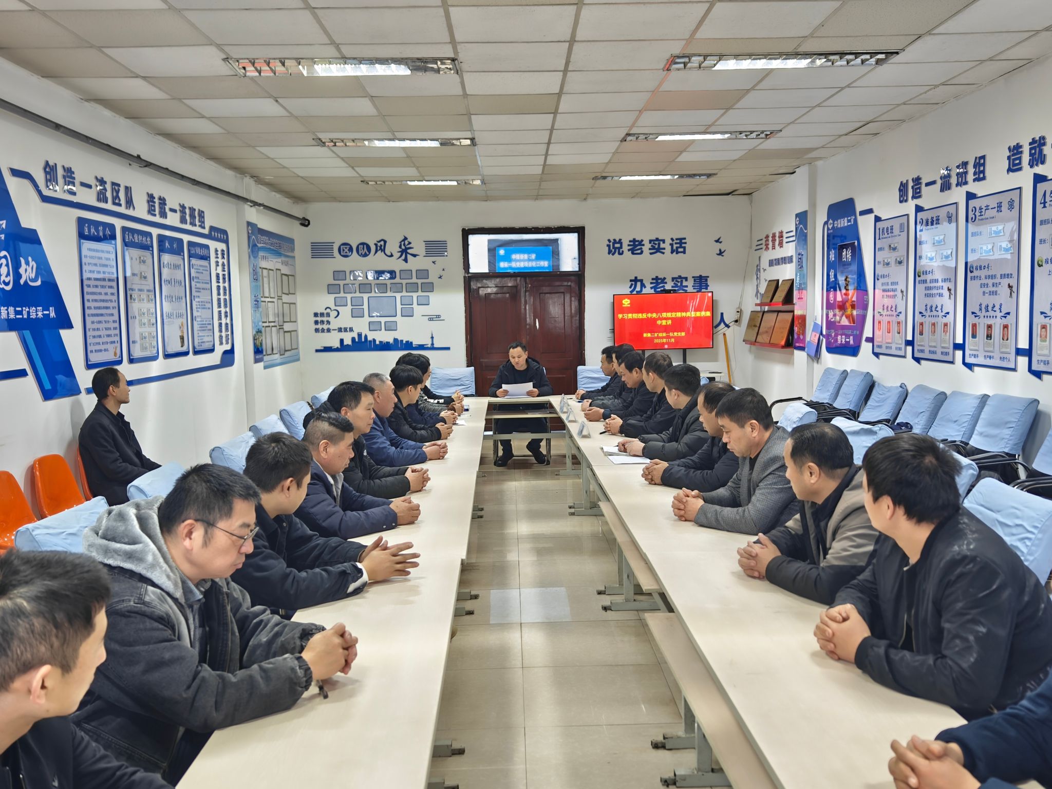 11月26日,新集二矿综采一队党支部组织开展违反中央八项规定精神典型案例宣教活动,区队干部职工参加。