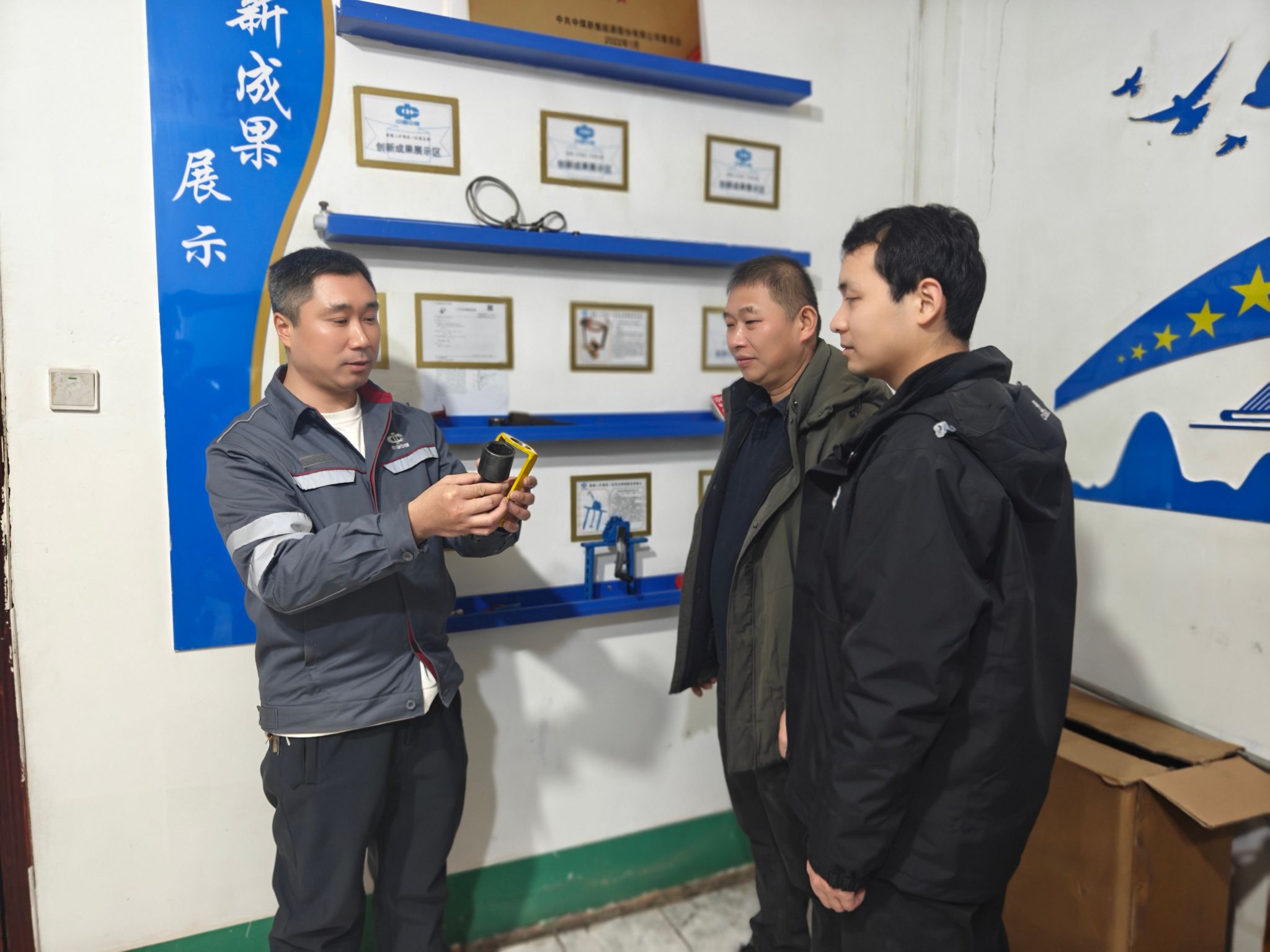 为推动典型经验真正转化为攻坚实效,该党支部号召全体干部职工对标先进、看齐榜样,聚焦生产现场的安全隐患和设备结构性缺陷,靶向开展科技创新攻关。在榜样的带动下,职工们纷纷投身技术革新,相继完成“电缆横梁过桥”“多功能方便挂钩”“拆除U型卡专用工具”“液压单体支柱防倒装置”“运输机易熔塞改造”“锚索机搅拌头防脱装置”等多个技术攻关项目,其中4项成果已成功获得国家专利,用实打实的技术创新为矿井安全生产保驾护航。
