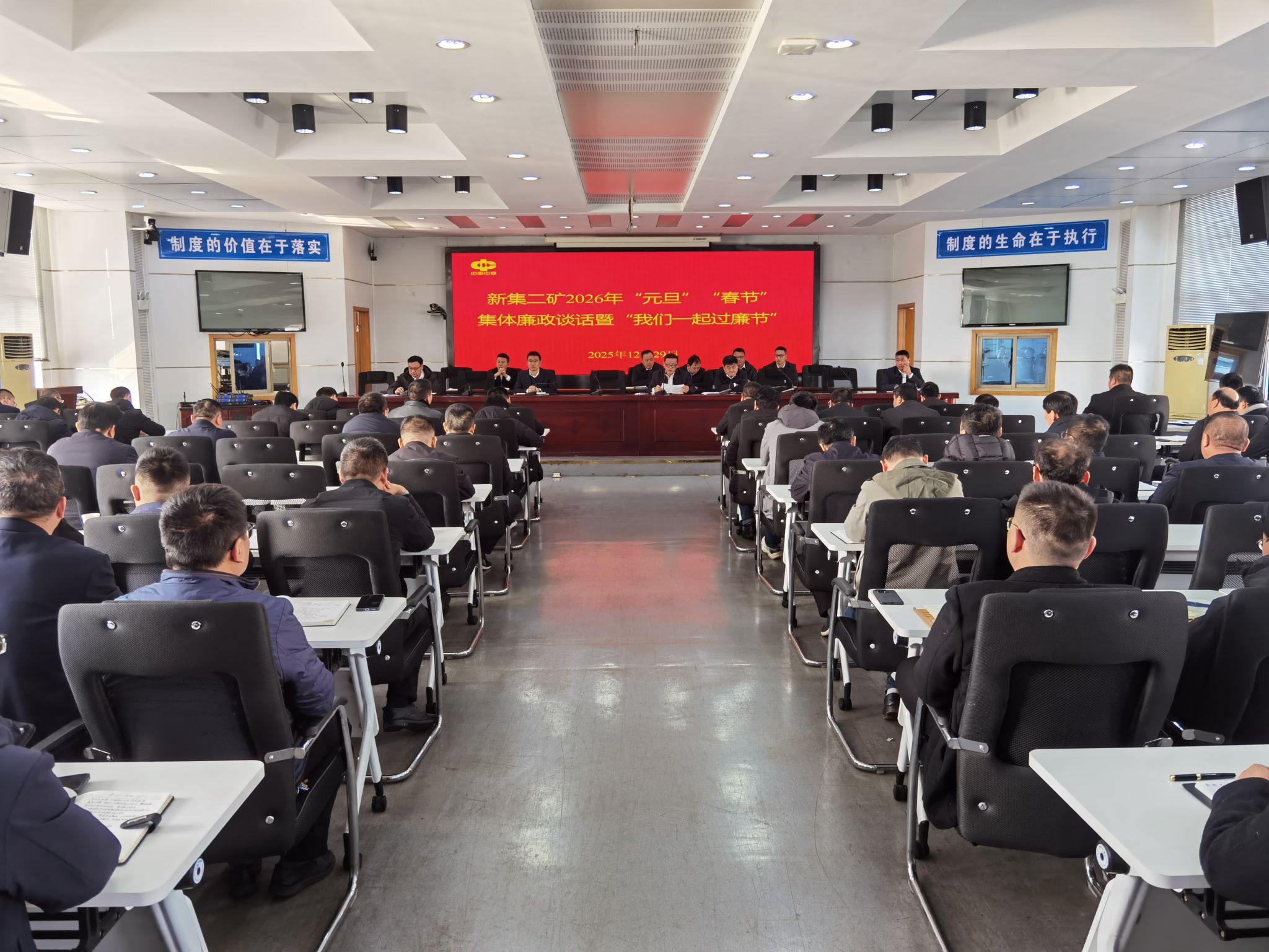 12月29日,新集二矿在行管楼第一会议室召开2026年“元旦”“春节”集体廉政谈话暨“我们一起过廉节”。矿党委书记、副矿长黄德圣等矿领导,基层(副)主管级管理人员参加。