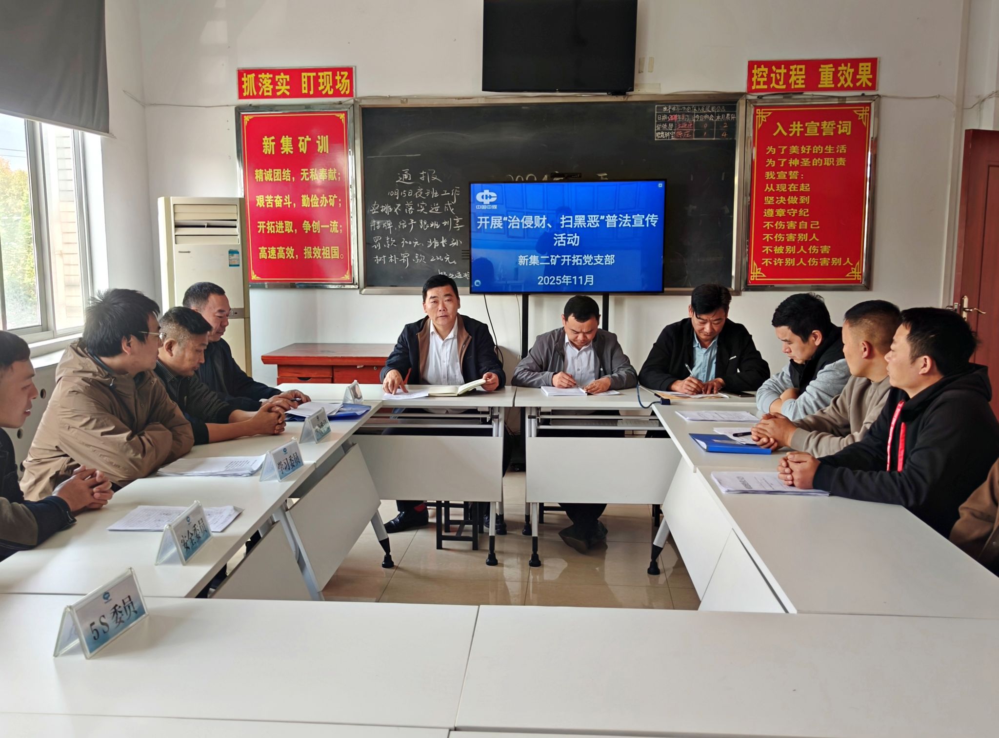 该党支部从三方面推动普法工作走深走实,一是骨干带头明法纪。组织党员、区队骨干先学深悟《中华人民共和国刑法》《中华人民共和国治安管理处罚法》中涉侵财、黑恶相关条款,结合区队实际,剖析“侵占物资”“恶意阻挠生产”等行为的法律责任与安全隐患,以案例警示划红线、强震慑。二是一线宣讲筑防线。将法治宣传延伸至井下作业现场,借力技术例会、班后分析会等契机,以“不触法纪红线、不犯安全底线、不碰管理雷区”的“三不要求”教育引导职工,推动法治意识融入日常工作与生活。三是常态推进固长效。持续深化“治侵财、扫黑恶”主题实践,以“强法治、优管理、保安全”为主线,将普法教育嵌入日常生产管理,为矿区安全稳定的法治环境筑牢坚实基础。