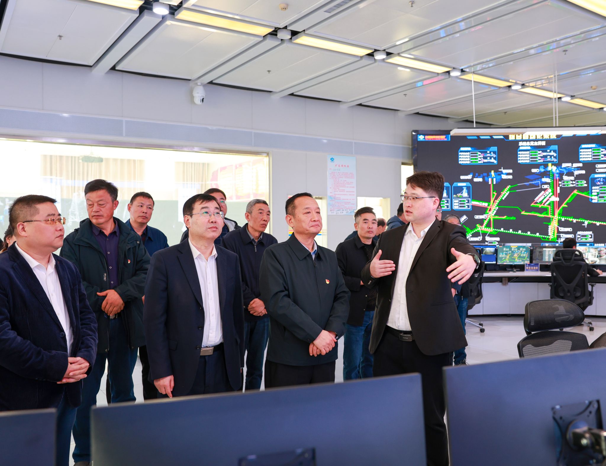 在行管楼一楼会议室,刘智宏一行首先观看矿井宣传片。随后,来到刘庄矿业调度指挥中心,现场察看矿井生产系统运行状况,认真听取了关于智能化调度平台建设、日常生产组织及井下实时作业情况的汇报,并通过全景电子屏幕详细了解各生产环节的数据动态与系统联动机制。最后,调研组深入安全信息可视化监控中心,与一线安全管理人员进行交流,询问风险辨识、隐患排查治理及安全管理制度执行情况,对刘庄矿业依托信息化、数字化手段提升本质安全水平的做法表示高度关注。