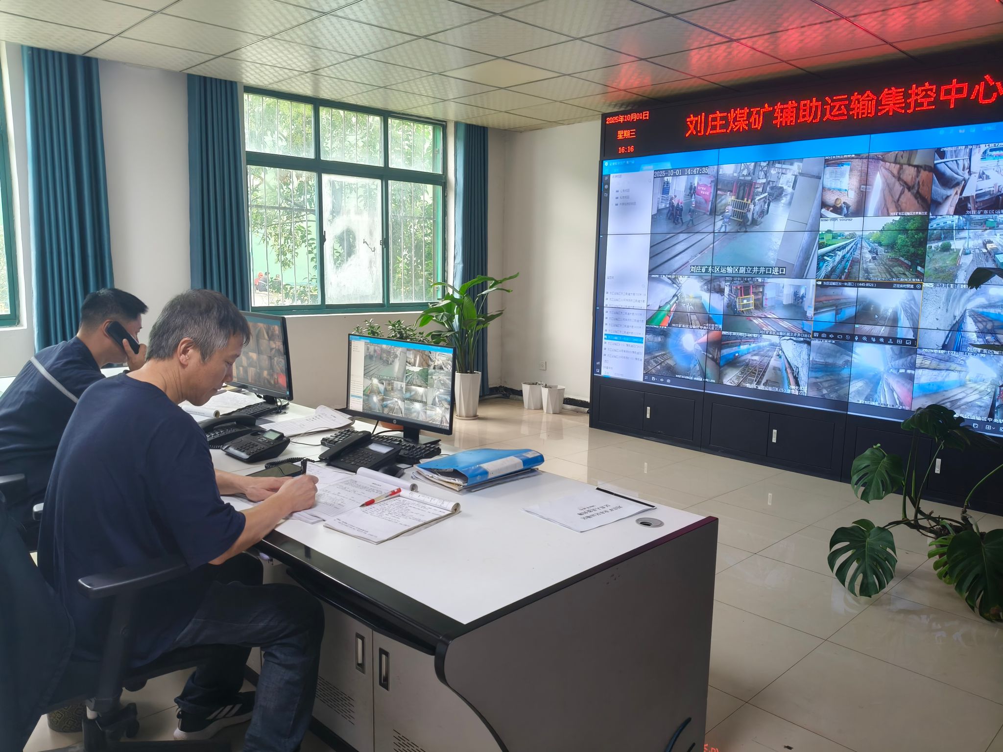 10月1日下午,刘庄矿业东区运输区调度站异常忙碌。区调度员王安瑞的左手夹着电话,右手握着笔,在笔记本上飞快记录:“东三8(6)煤轨道石门卧底整道作业还需多久?好,注意盯紧施工安全,有情况随时汇报。”挂了电话,他又盯着集控中心大屏,手指在键盘上敲击,调出井下电机车运输轨迹。