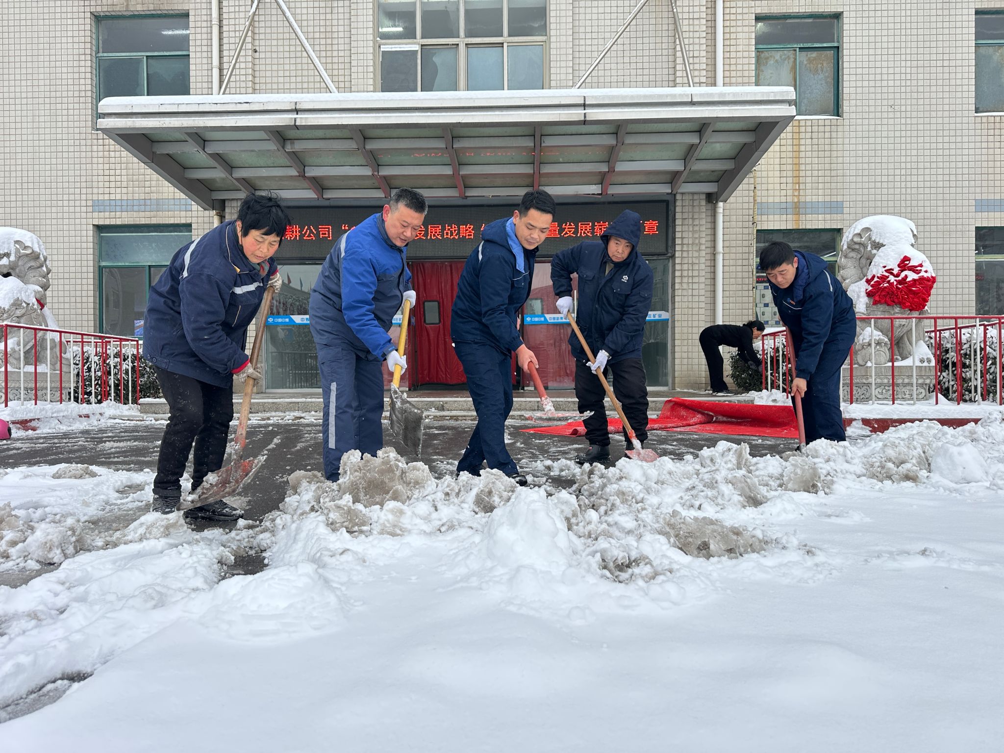 各基层党支部书记率先垂范,带领党员冲锋在前。清晨,各党支部组织党员突击队,对西区工广区域、副井井口、运输主干道等关键区域展开扫雪除冰。各部门协同联动,组织人员及时清理设备设施积雪,保障线路畅通与运行安全。后勤人员加强巡查,在楼梯、路口铺设防滑垫,设置警示标志。